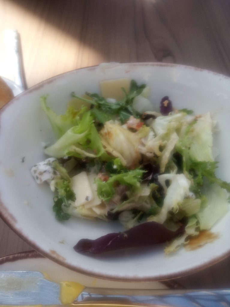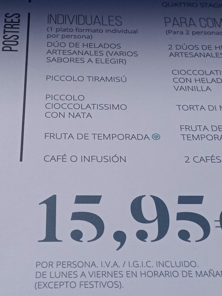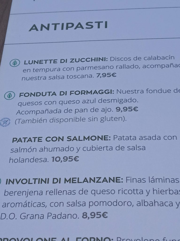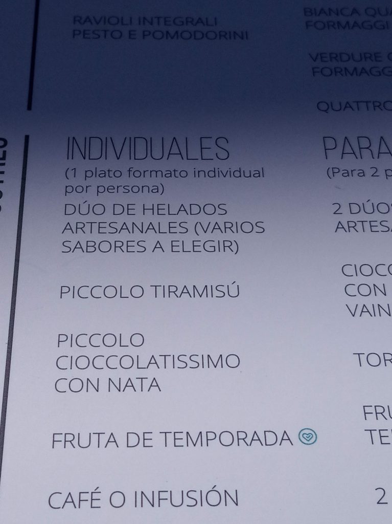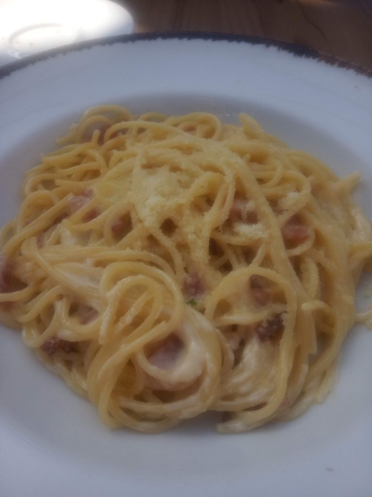 Yo pedí a la carta Patate con Salmone ( patatas asadas con salmón ahumado y salsa holandesa) por 10,95 € y mi marido el menú de 15,95 € compuesto de Piccolo Insalata Di Formaggio, Spaghetti alla carbonara y de postre Piccolo Cioccolatissimo con nata.
