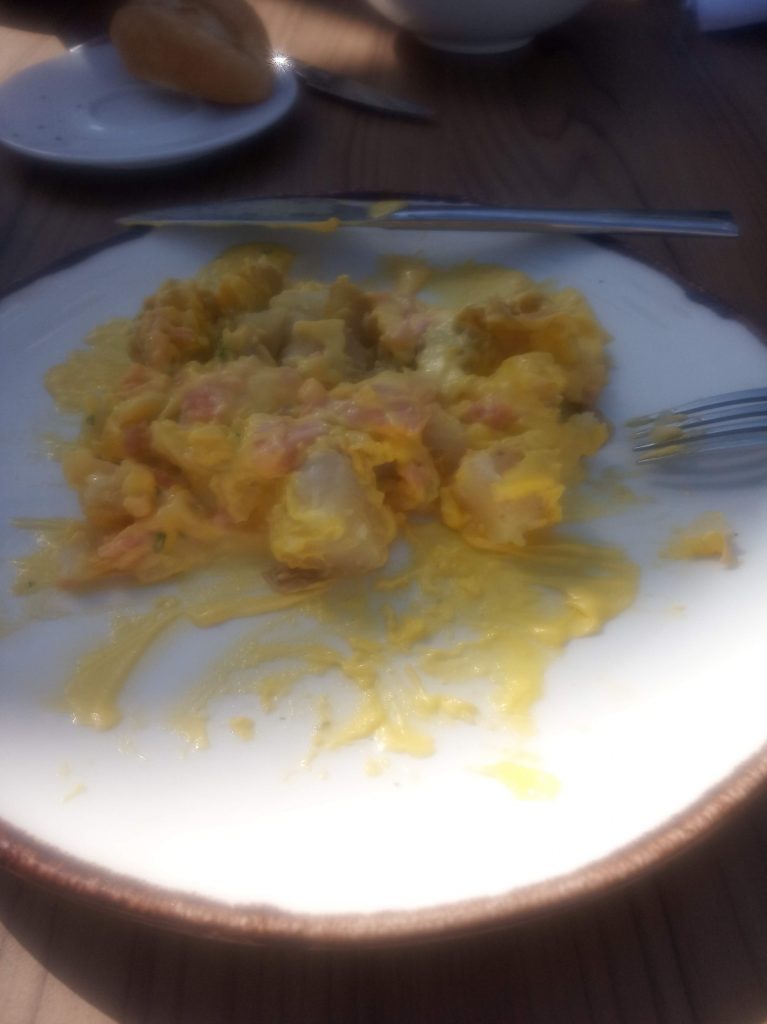Todo estaba muy bueno, las patatas eran pequeñas y con piel, con salmón ahumado picado y cubierto de salsa holandesa. Una pieza de pan por persona chico y calentito.