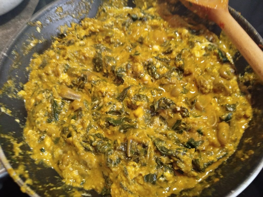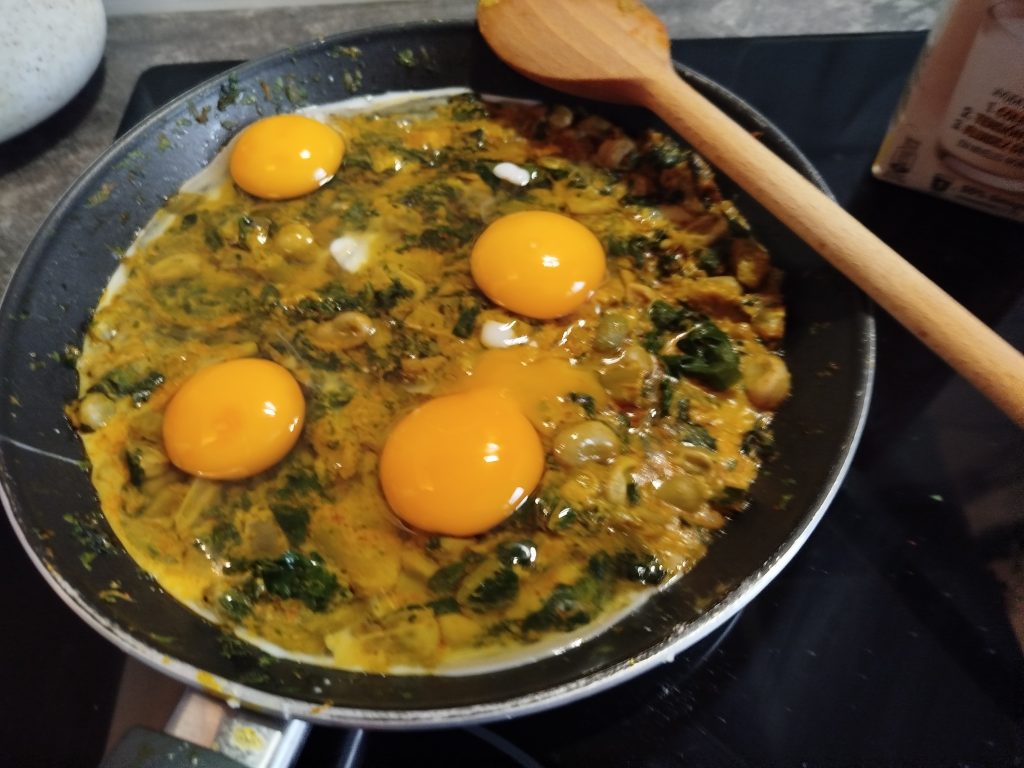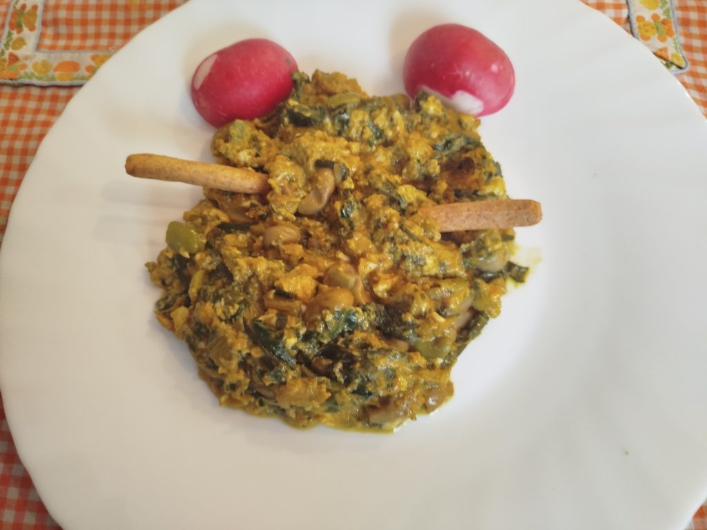A la hora de comer, en una sarten echar un poco de aceite, las verduras y especias con un poco de sal, añadir un poco de bebida de soja o leche, y mezclar todo muy bien.