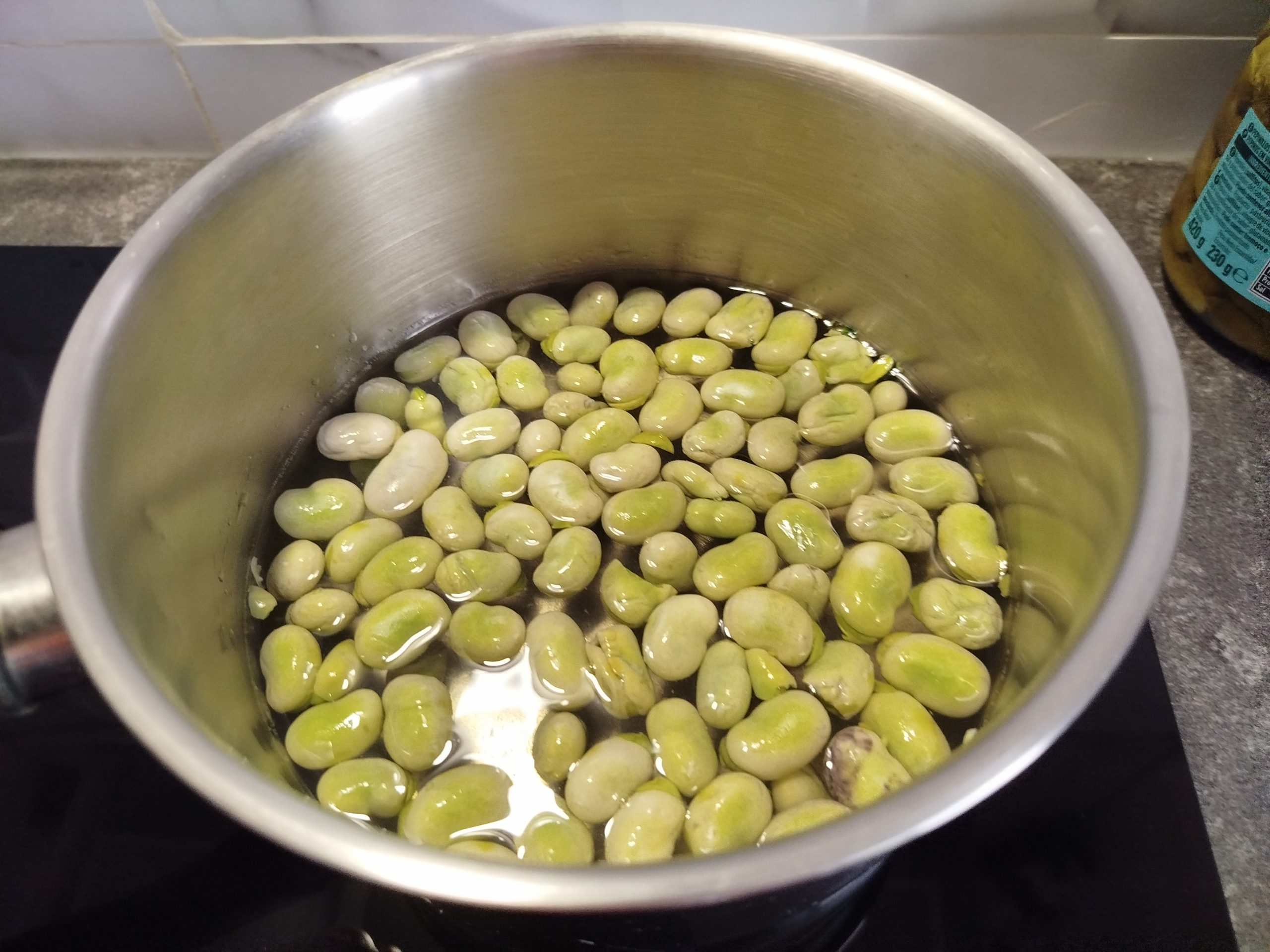 En un cazo, poner las habas baby, y cubrir con agua, cuando empiece a hervir, añadir un poco de sal, y dejar cocer el tiempo que indica el paquete, o hasta que estén tiernas. Si quieres puedes quitarles la piel, eso ya es cuestión de gusto.