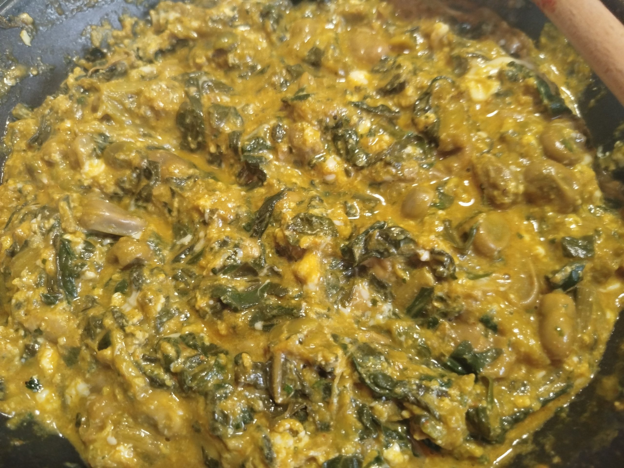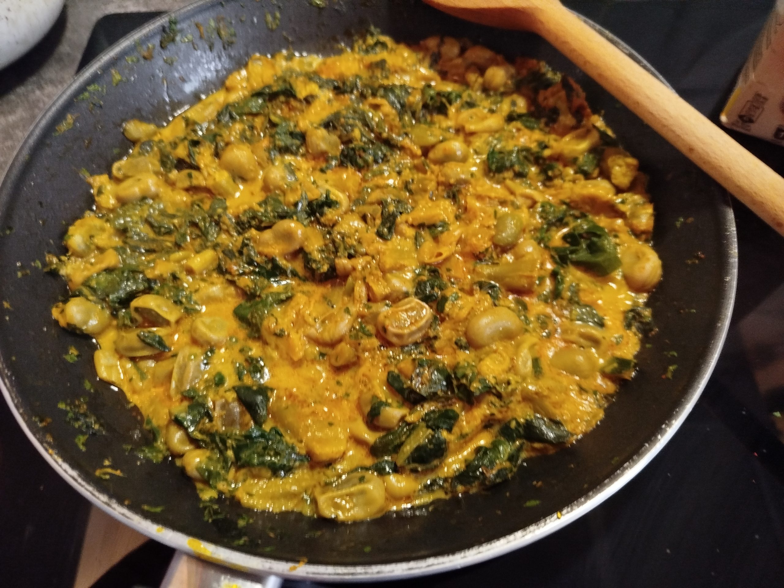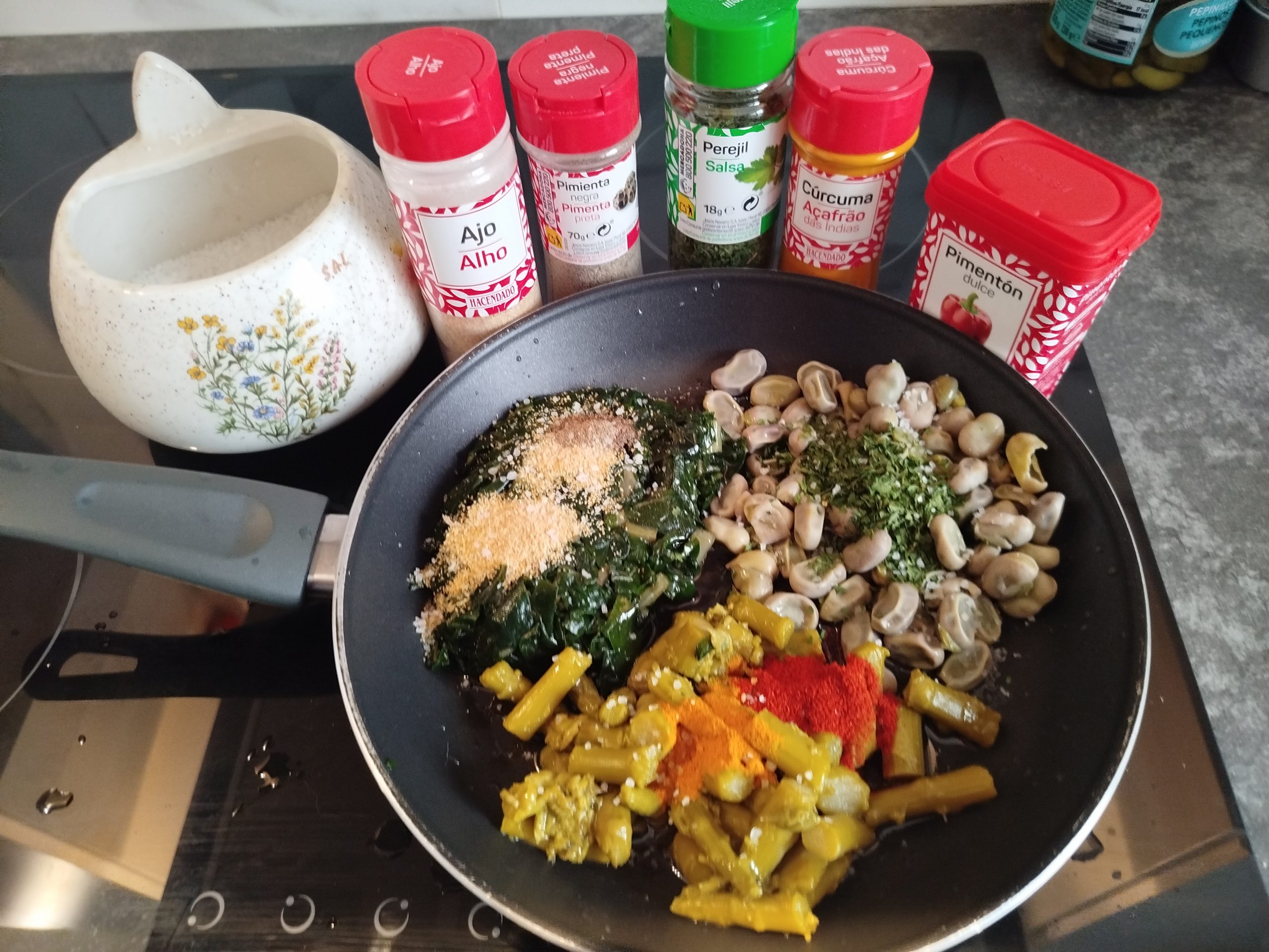 A la hora de comer, en una sarten echar un poco de aceite, las verduras y especias con un poco de sal, añadir un poco de bebida de soja o leche, y mezclar todo muy bien.