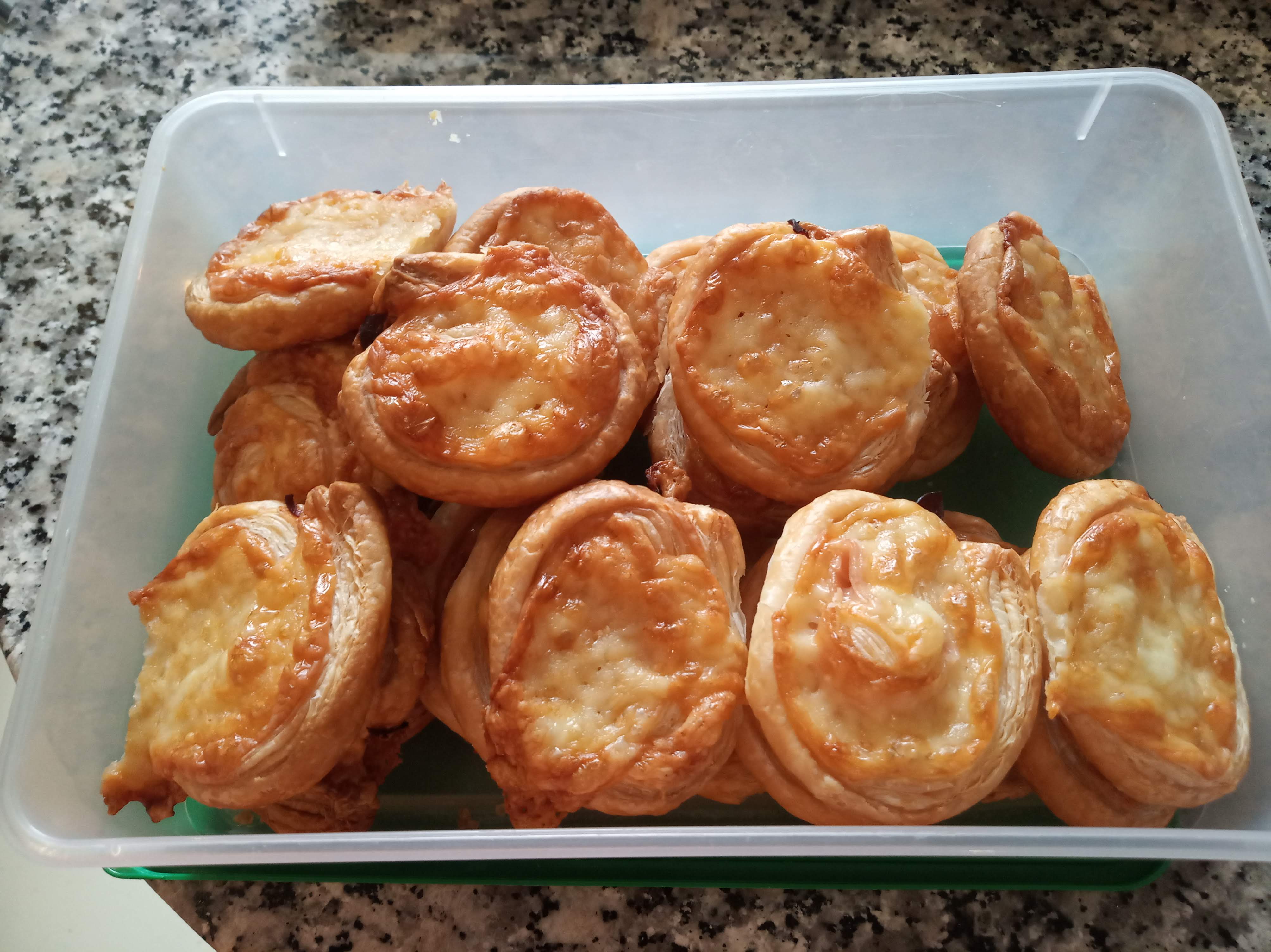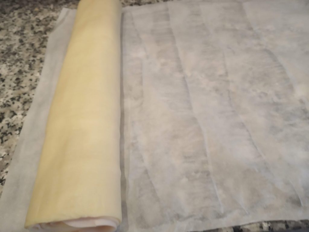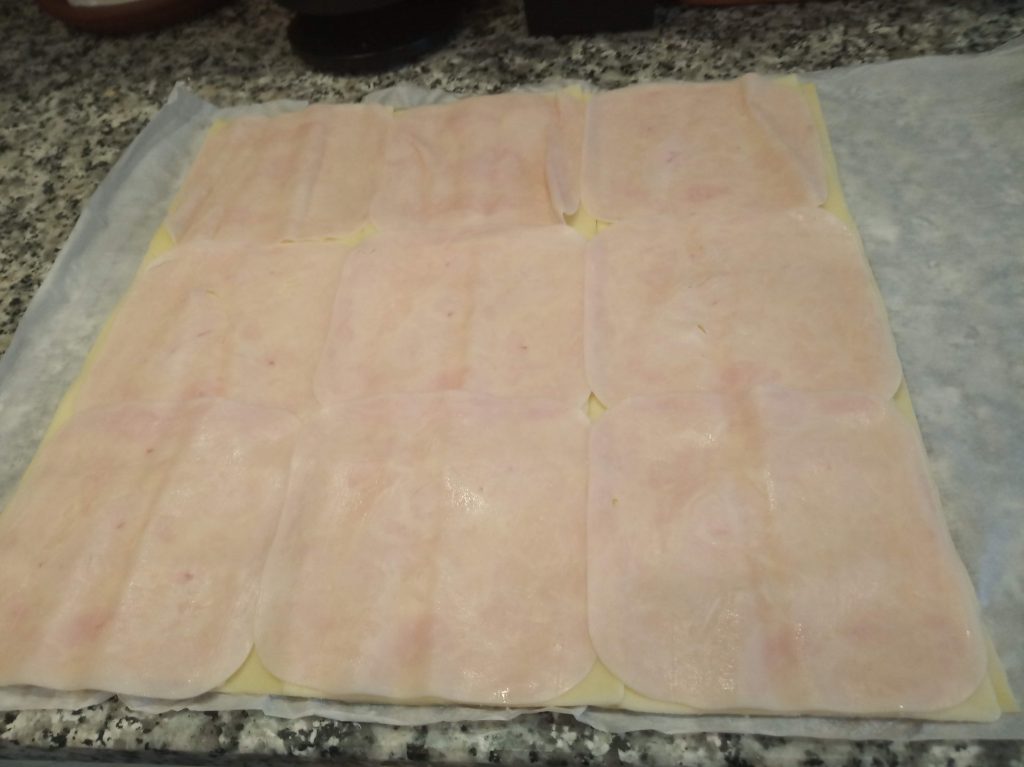 Extiende la masa de hojaldre, coloca una loncha de queso junto a otra, desde el filo, hasta terminar de cubrir toda la masa. Si hace falta, parte el queso para cubrir la última tanda si el sitio es más pequeño, no sobreponer encima.