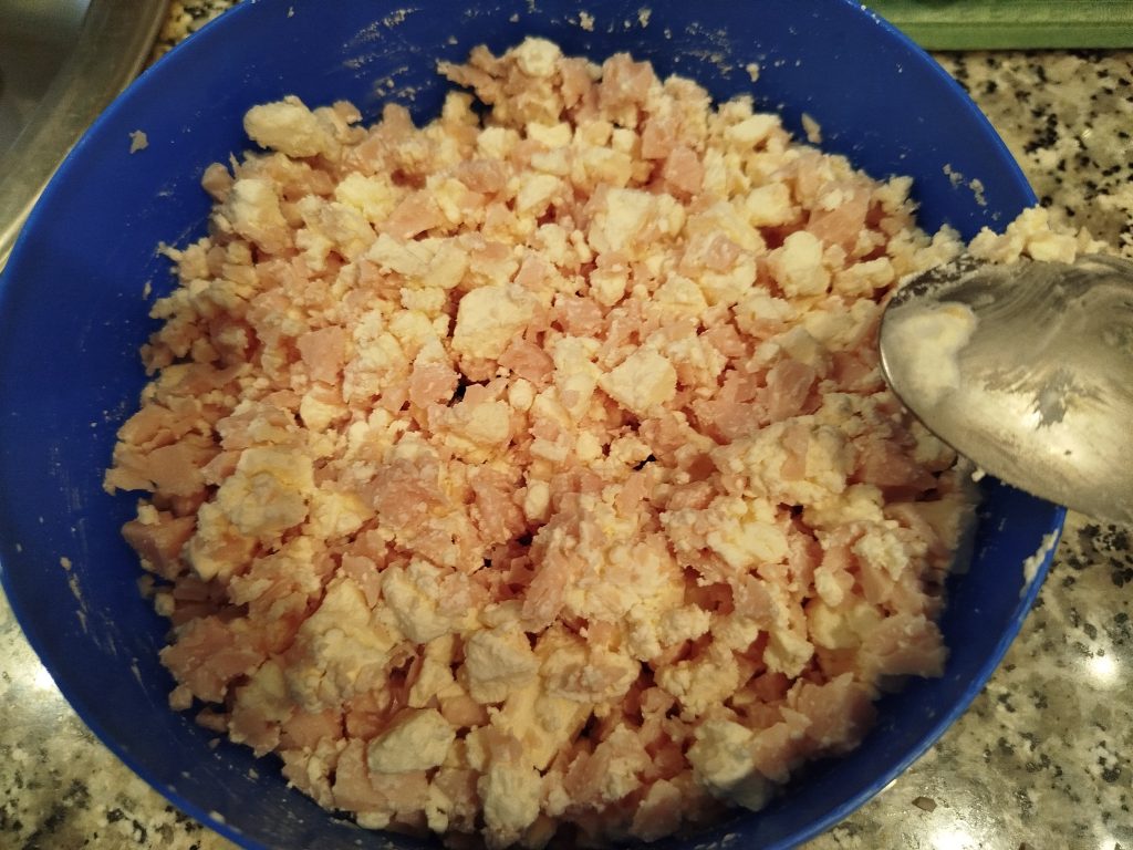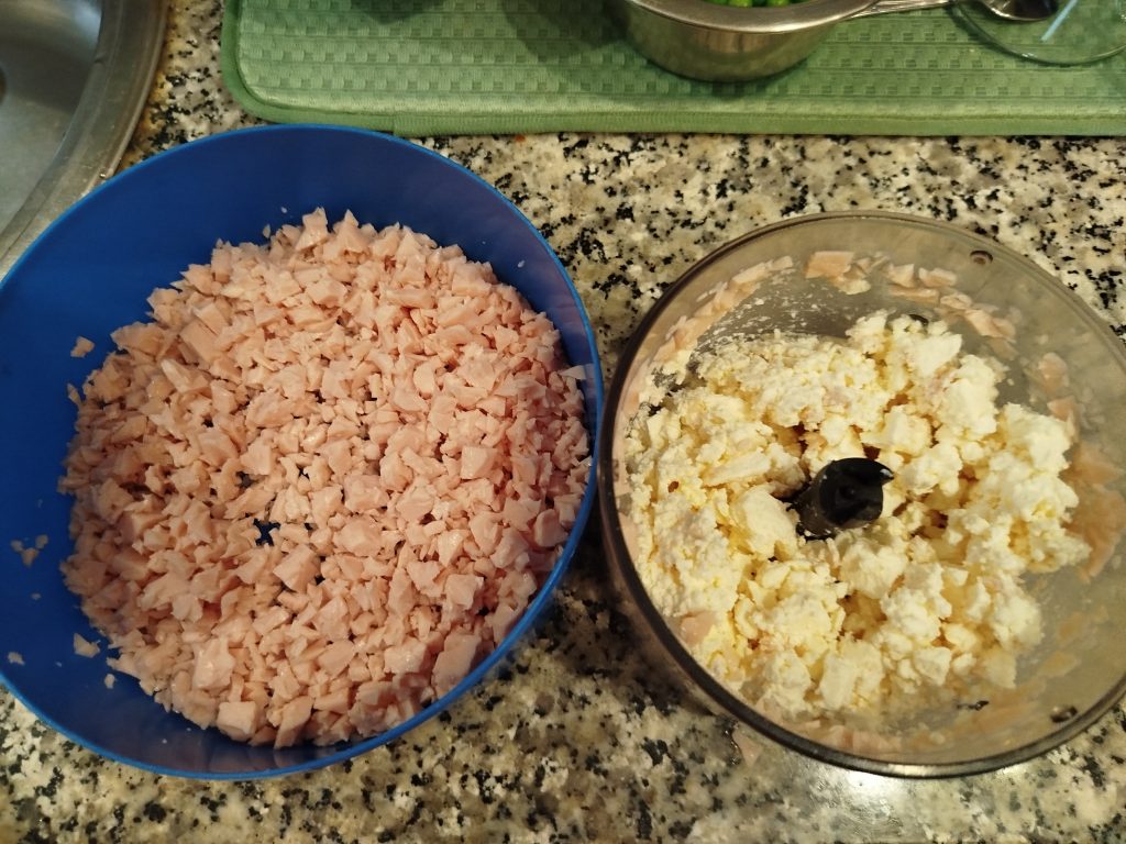 Picamos a mano o en la picadora, por separado, los tacos de pavo y las perlas de mozzarella.