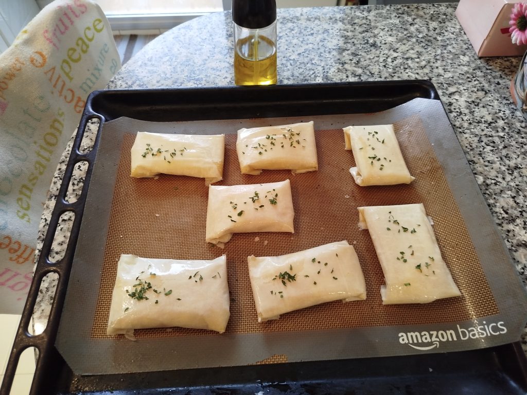 Ir colocando los rollitos en la bandeja sobre el papel de horno, con el doblez para abajo y pintar con aceite y decorar con perejil picado.