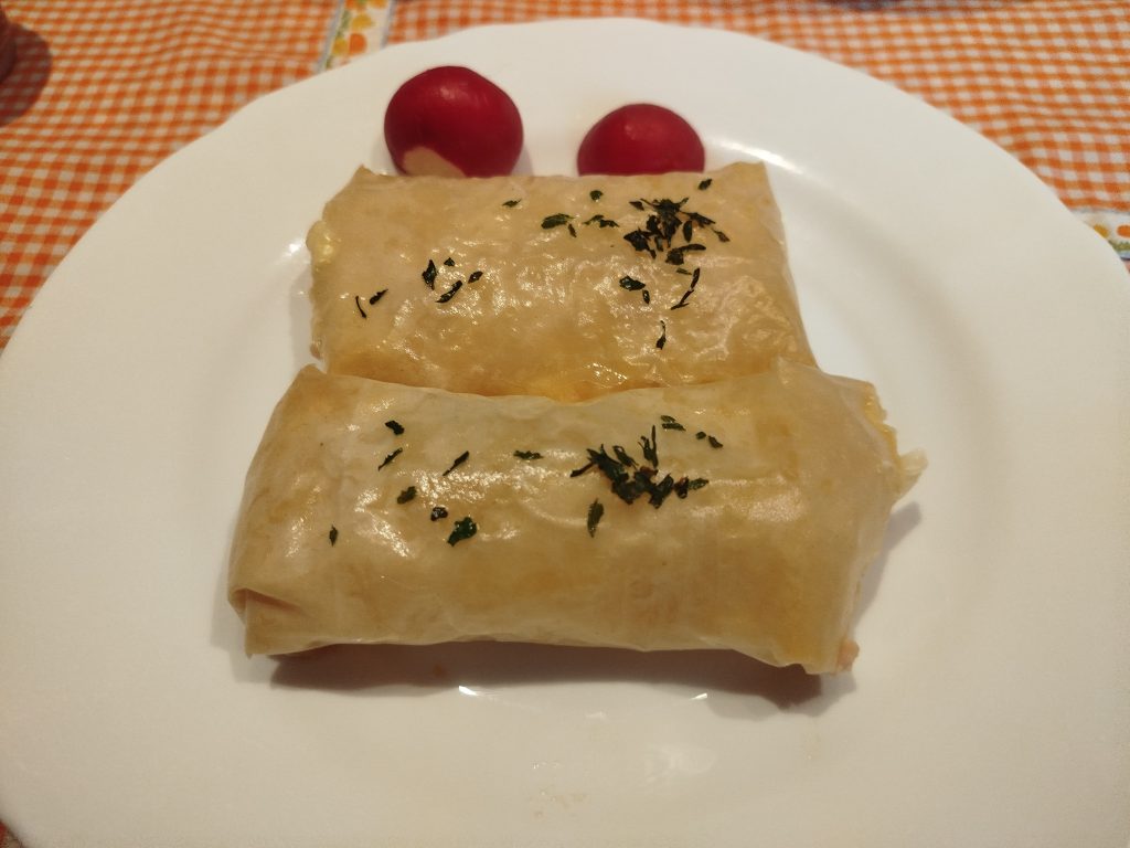 Con 7 hojas de masa Filo, picado el pavo, y luego el queso, añadir las salsas, mezclar todo, doblar por la mitad cada hoja, pintar con aceite, y rellenar en el centro de una punta, y enrollar, dejando el cierre abajo. Pintar todas con aceite por encima y perejil picado.