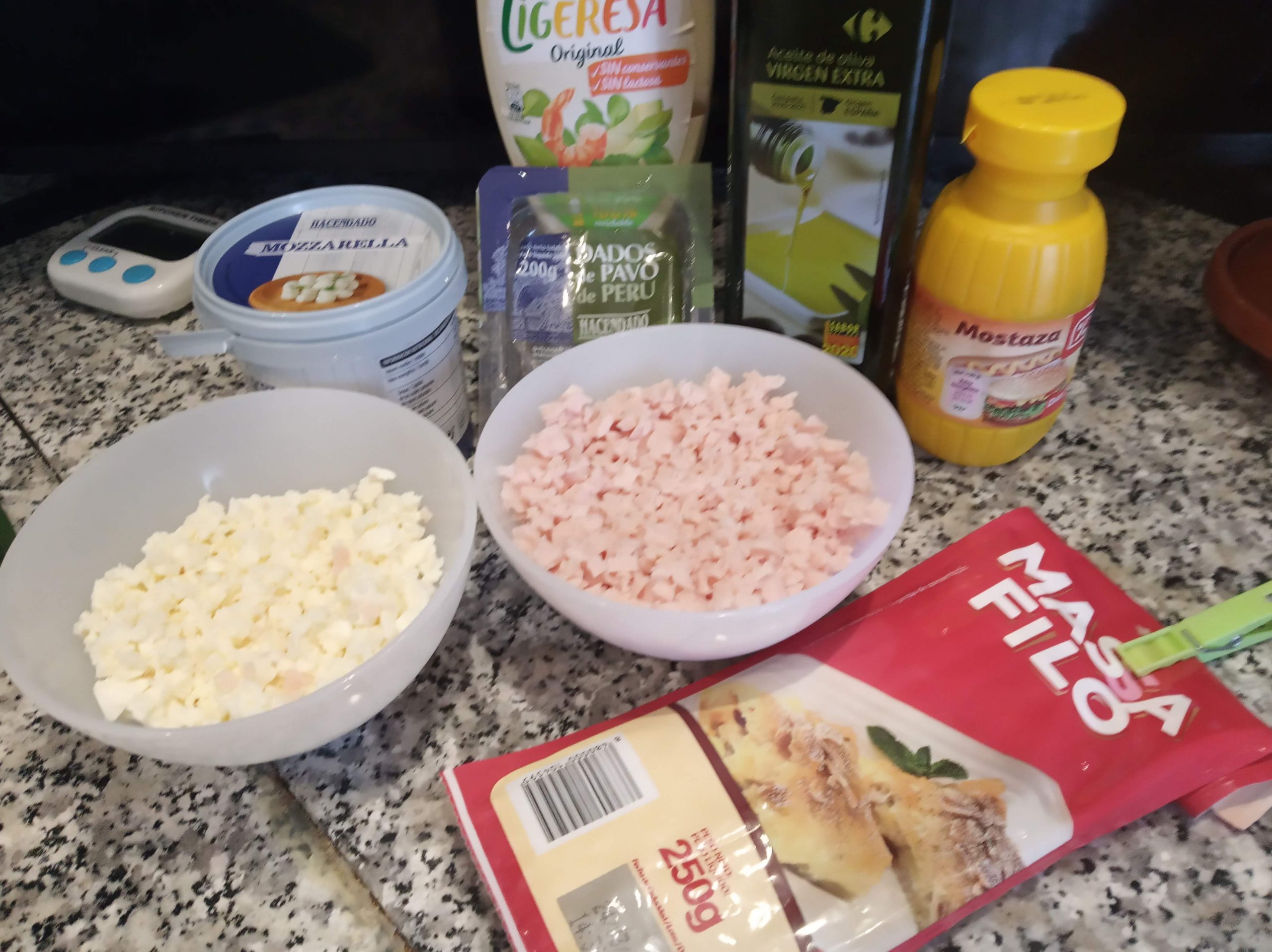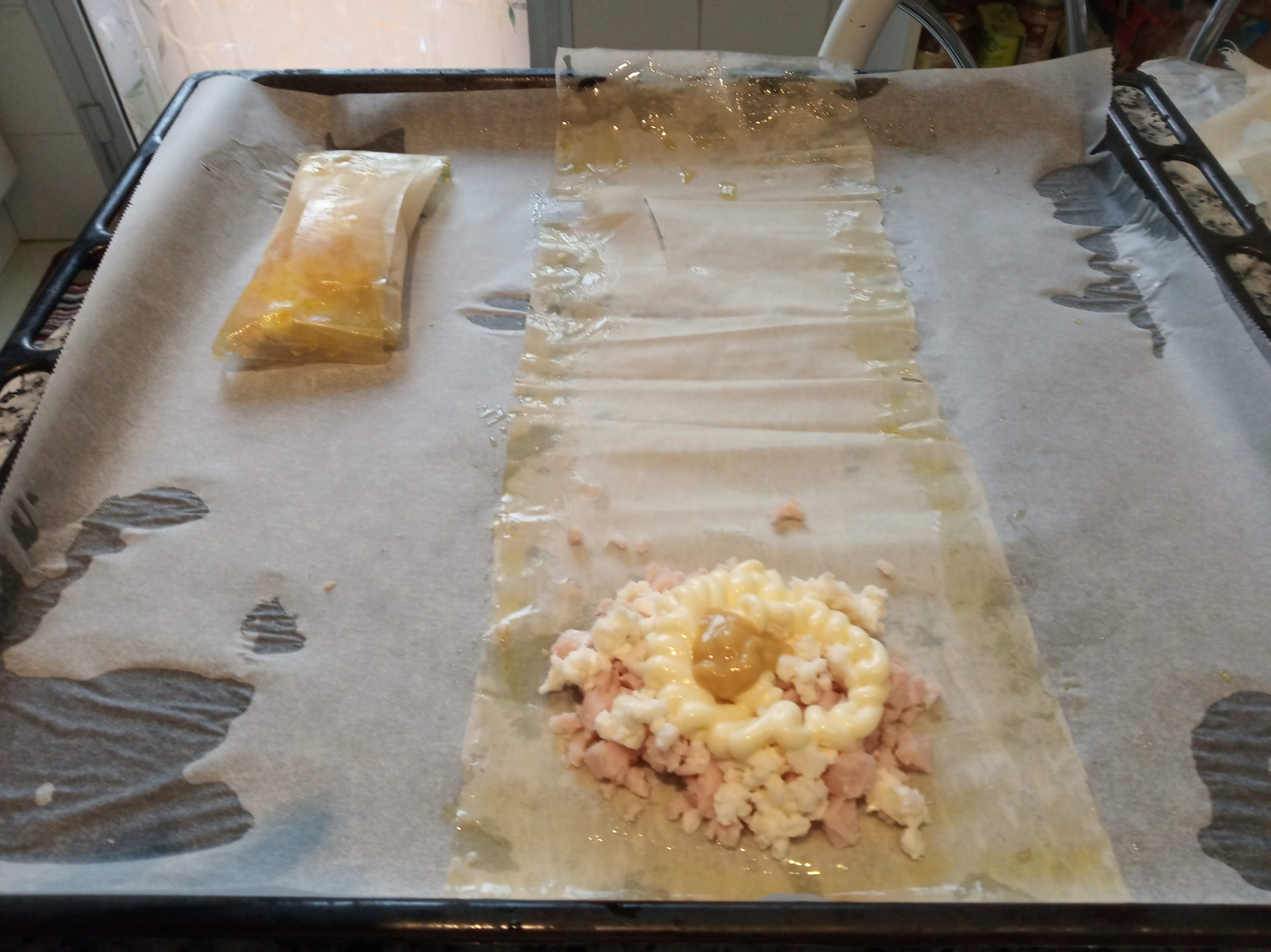 Cortamos 1 masa filo por la mitad, la pintamos con aceite y ponemos en el centro de una de las puntas, un poco de queso y otro de pavo, le echamos un poco de mayonesa y mostaza, cerrar la masa haciendo un rollito, dejando los filos libres, para cuando llegue al final, meterlos para dentro.