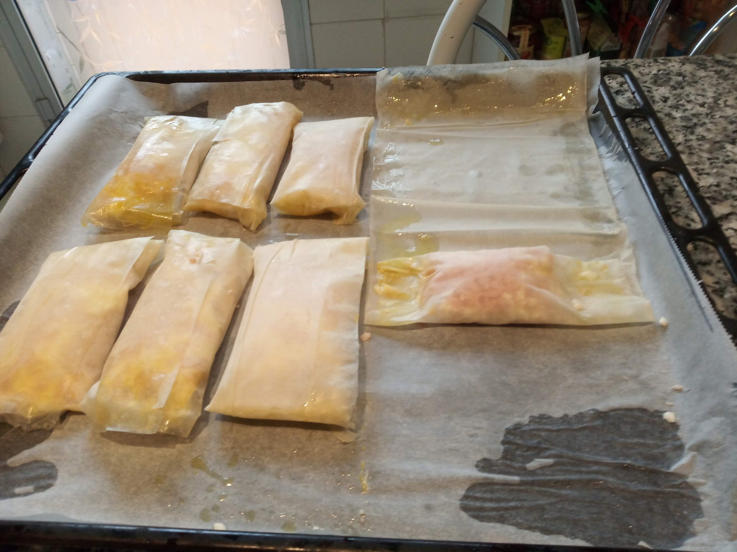 Con 7 hojas de masa Filo, picado el pavo, y luego el queso, añadir las salsas, mezclar todo, doblar por la mitad cada hoja, pintar con aceite, y rellenar en el centro de una punta, y enrollar, dejando el cierre abajo. Pintar todas con aceite por encima y perejil picado.