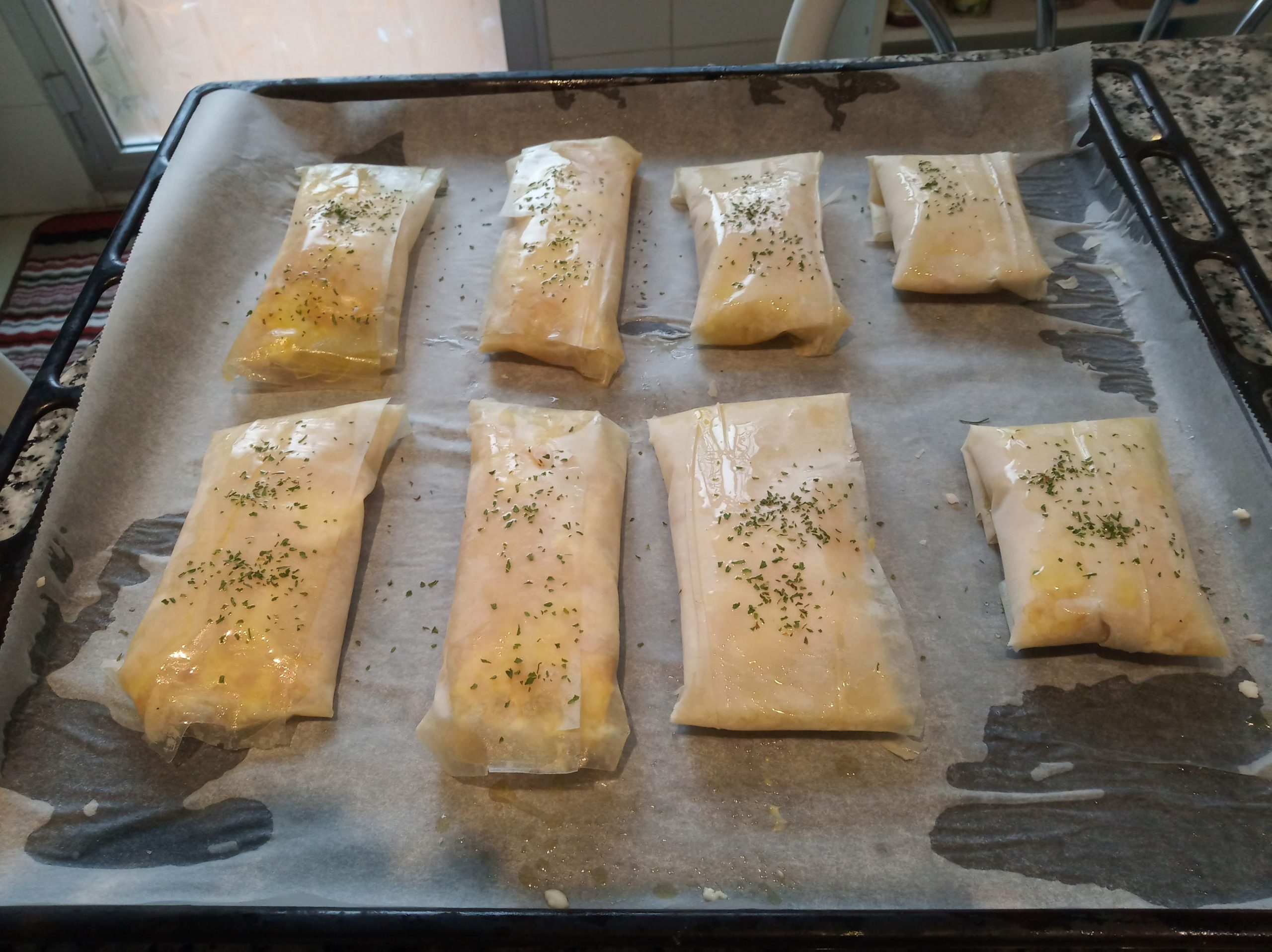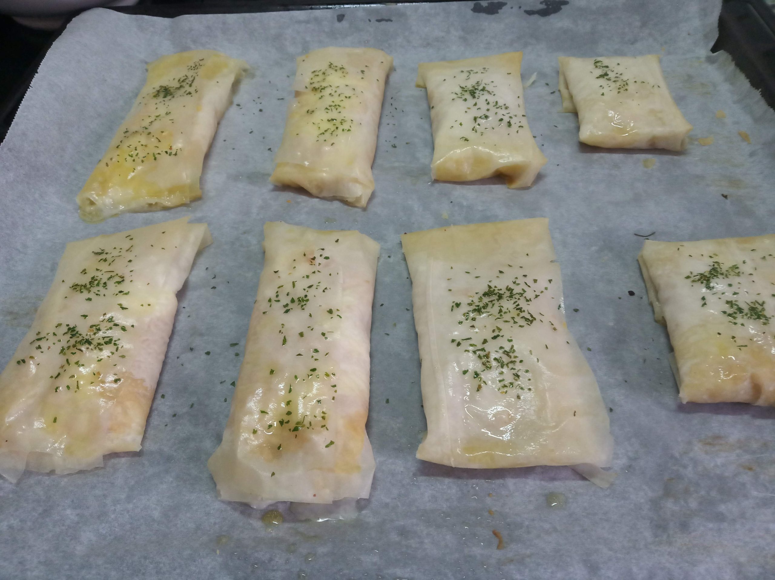 Ir colocando los rollitos en la bandeja sobre el papel de horno, con el doblez para abajo y pintar con aceite y decorar con perejil picado.
