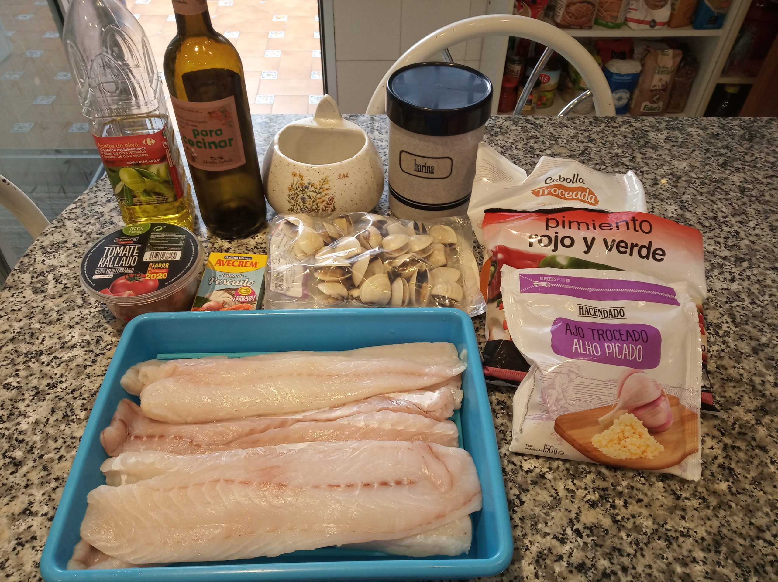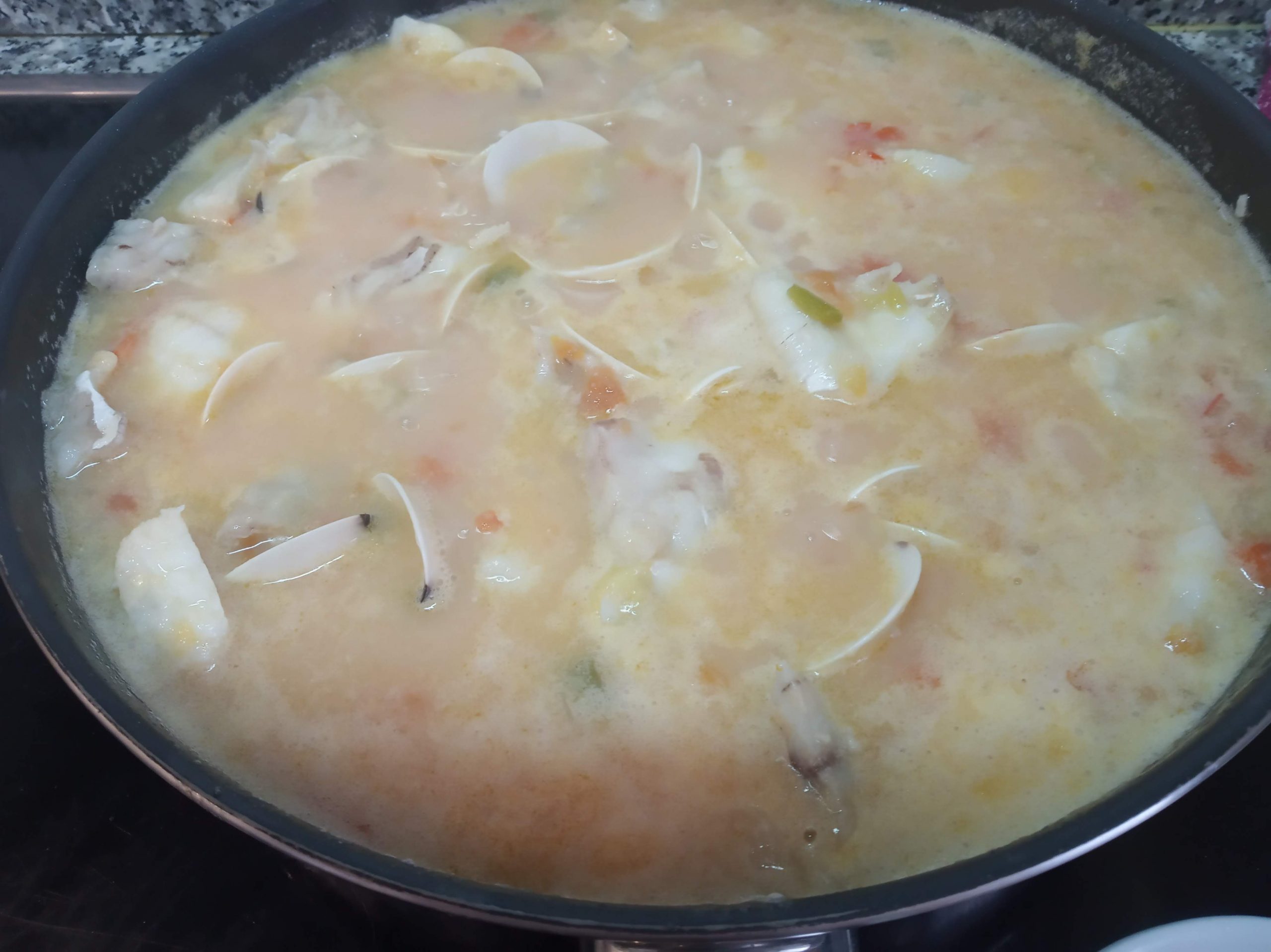 Cuando empiece a hervir le echamos la rosada troceada y las almejas, frescas o congeladas, que viene ya cocidas.