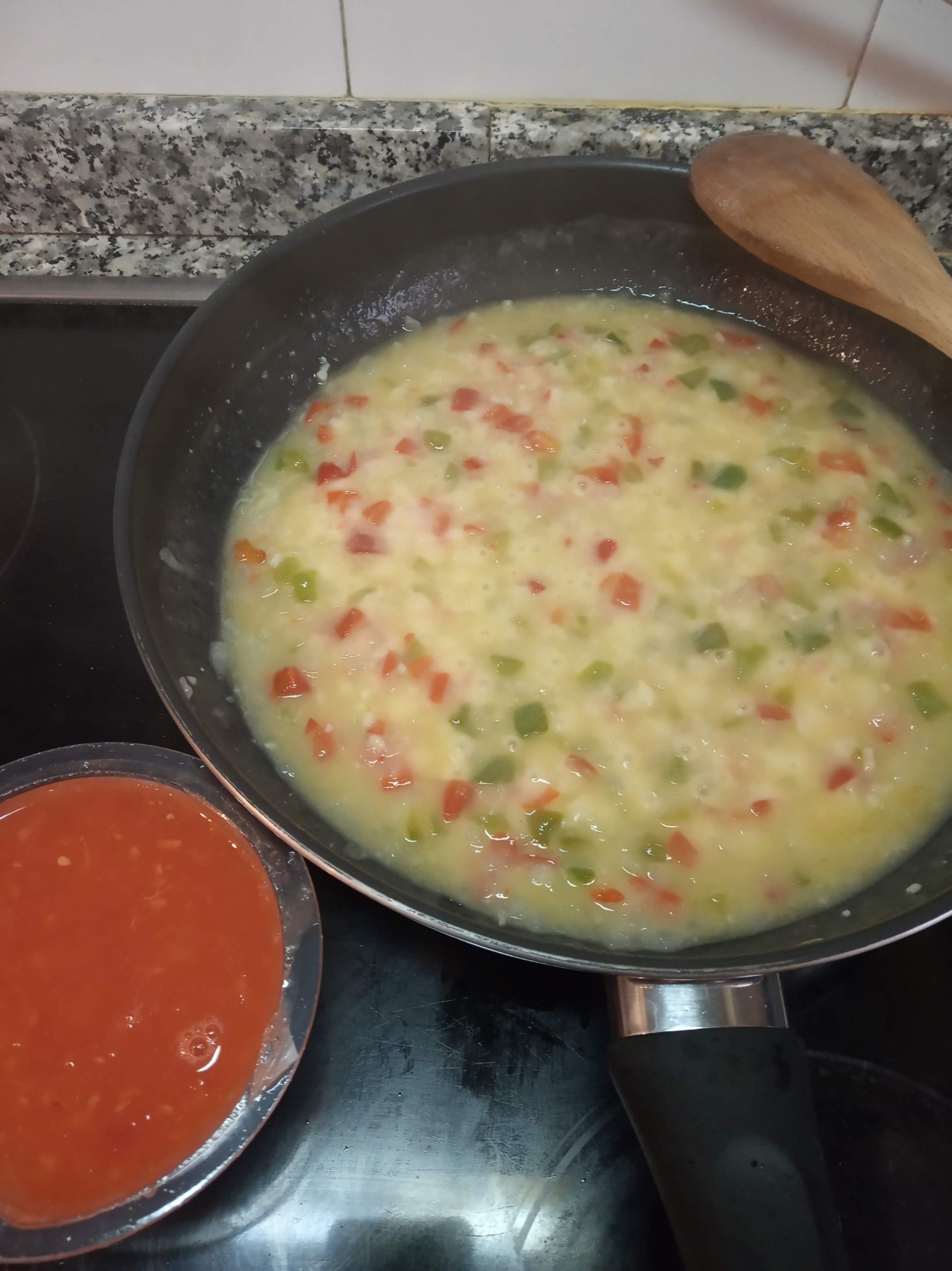 En una sartén grande, echar el aceite y refreír, la cebolla, ajo y pimientos troceados, puedes ser fresco o congelado. Pochar durante unos 10 minutos.