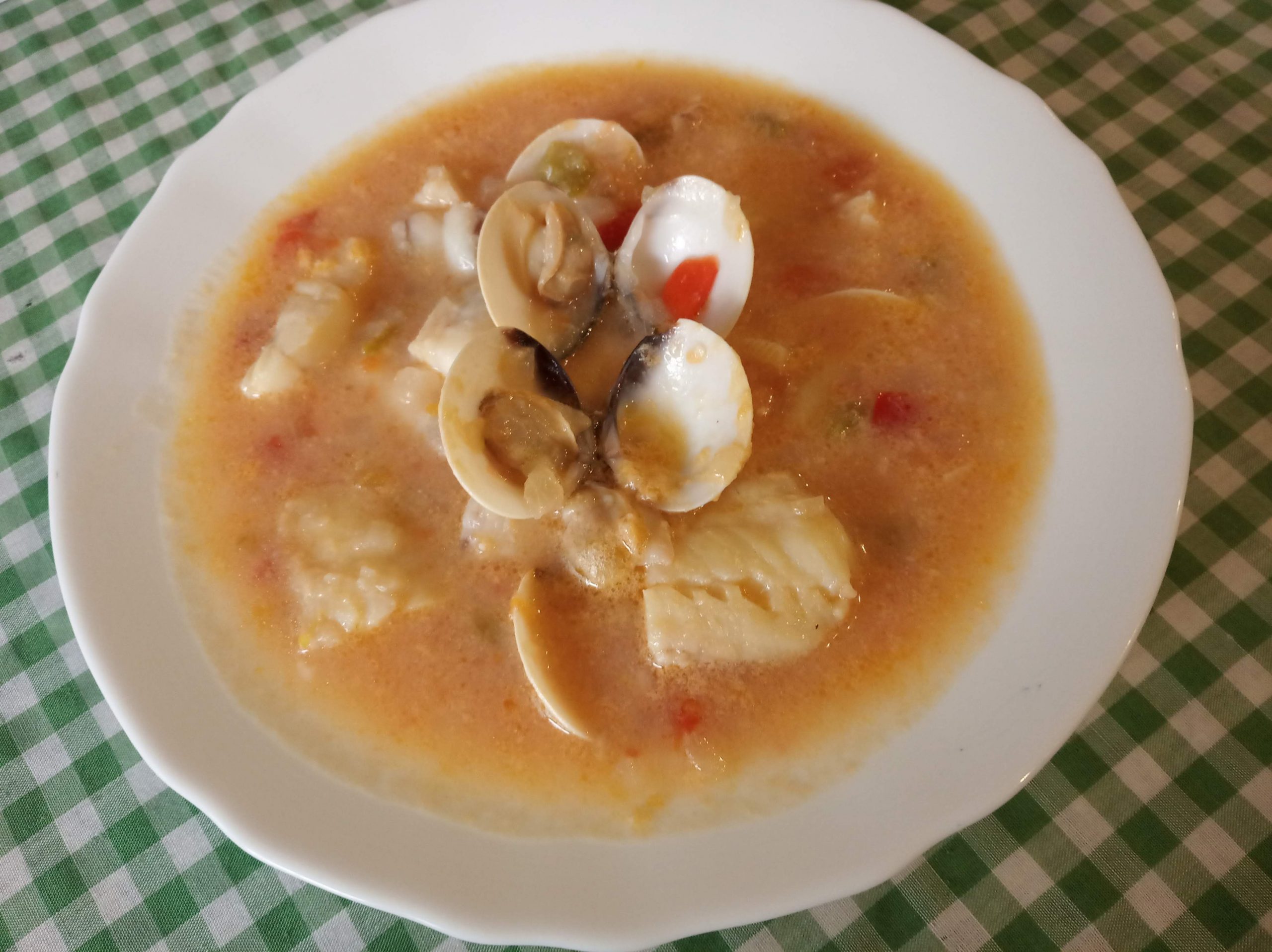 Servir en plato hondo y caliente, repartiendo la rosada, almejas y el caldo con la verdura.