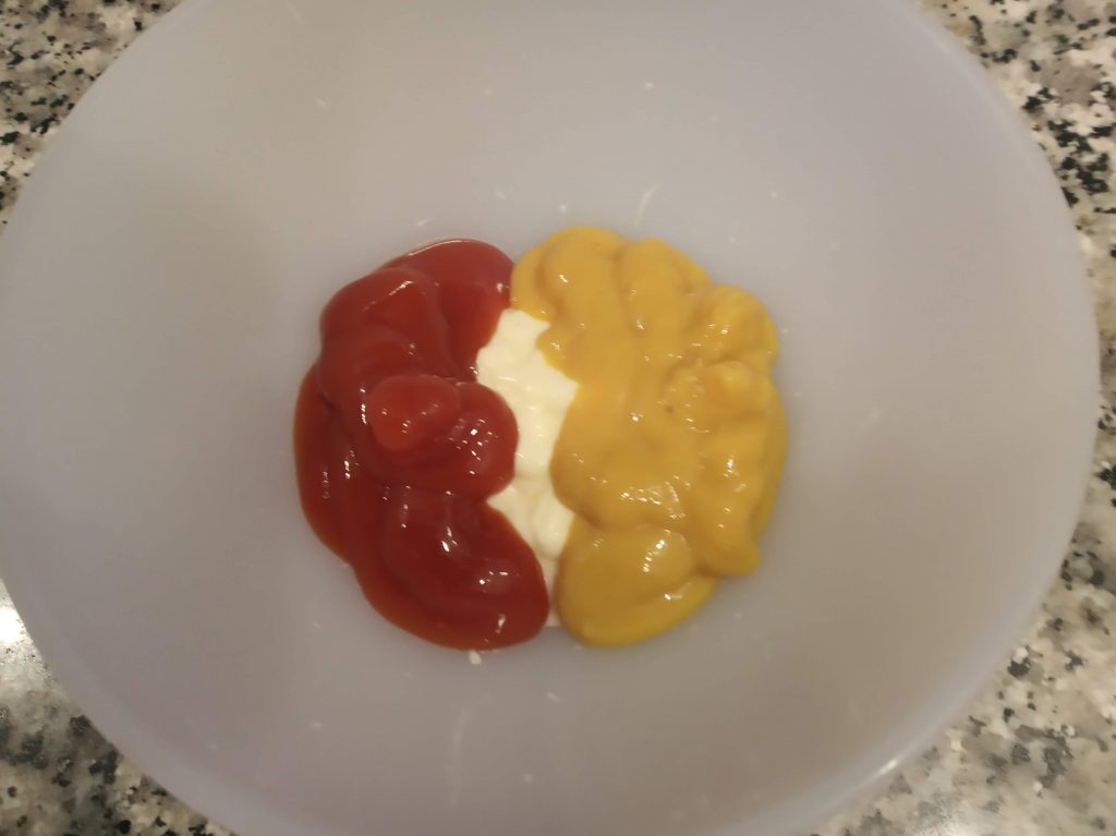 Mezclar en un bol, la mostaza, kétchup y mayonesa.