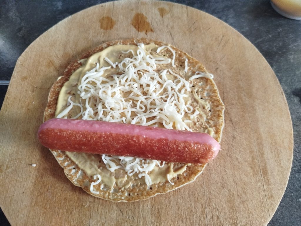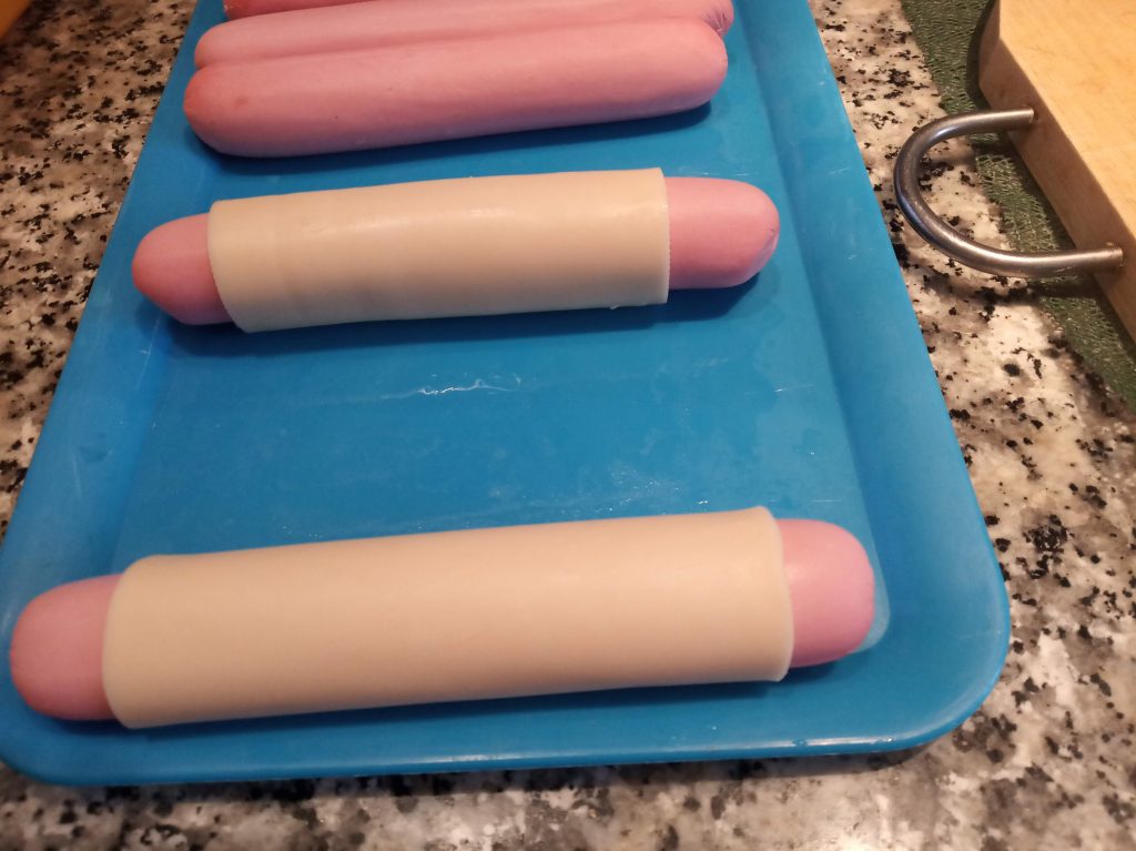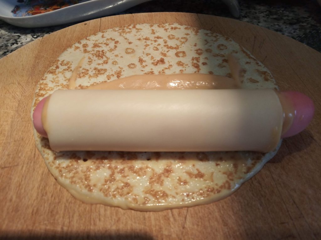 Enrollar una salchicha en una loncha de queso, o extender el queso rallado. Foto del 30/07/2025.