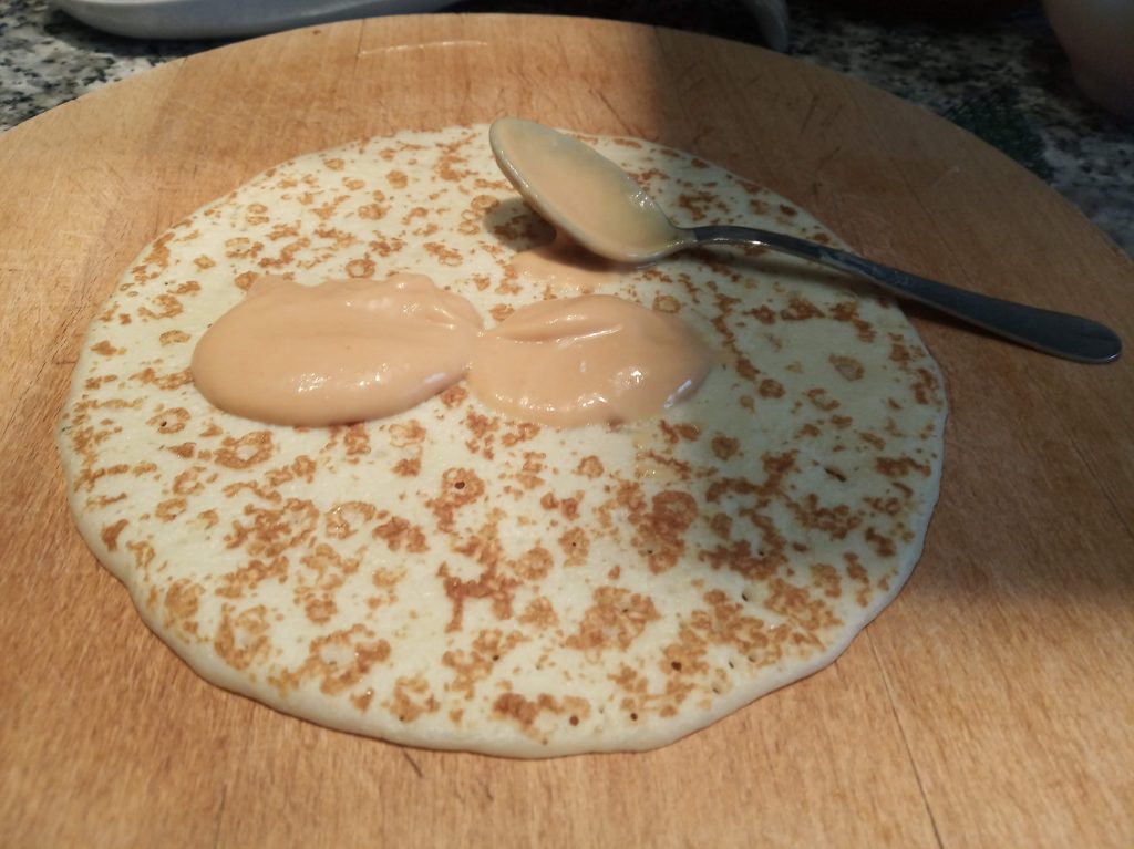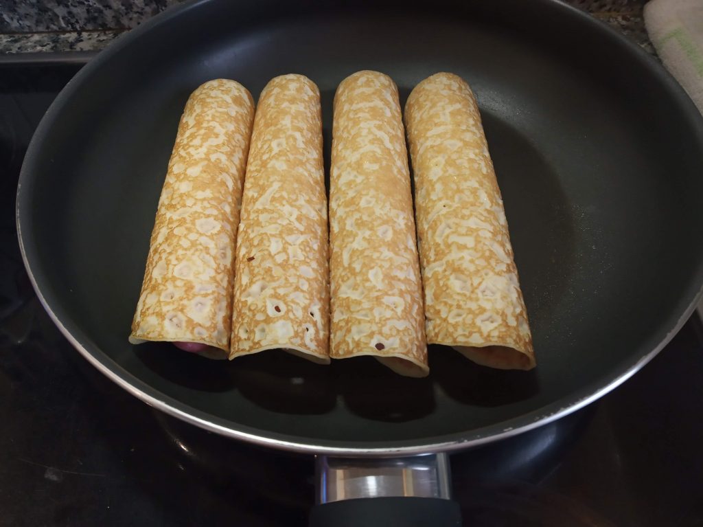 Colocar en el filo de la crepe, y enrollar, dejando para abajo el final.