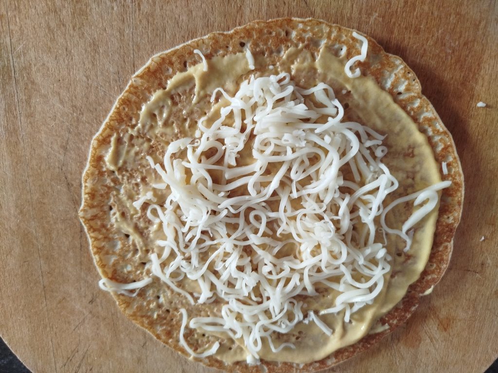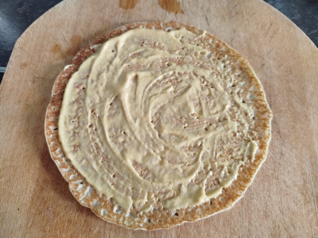 Poner una crepe y echarle una cucharadita de la mezcla, extender bien.