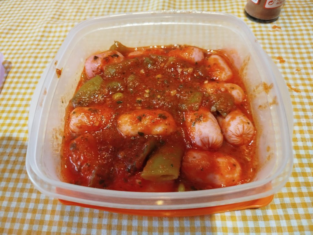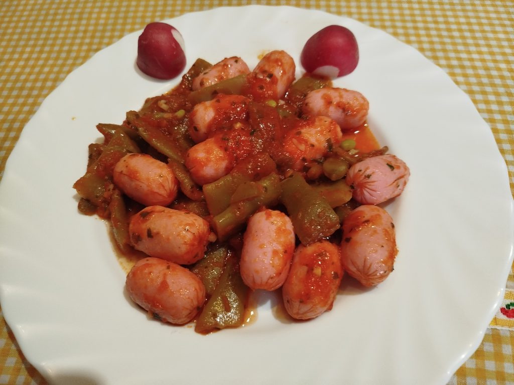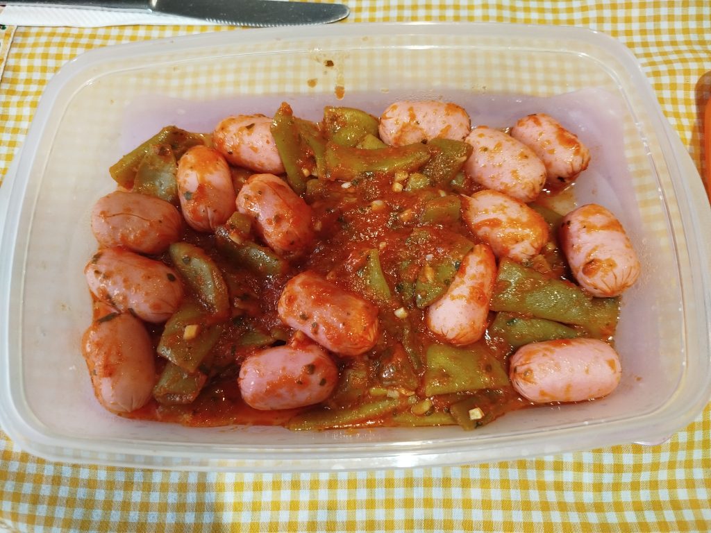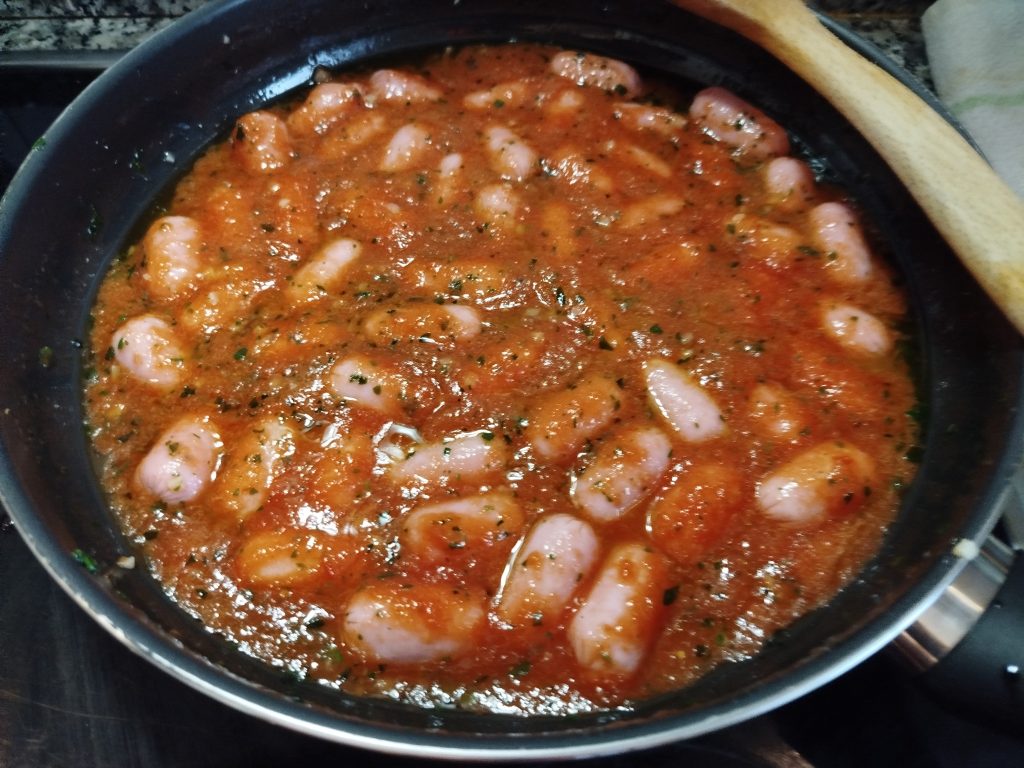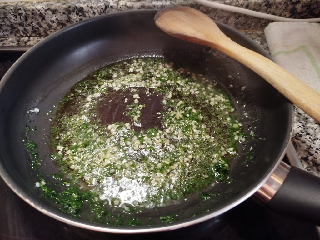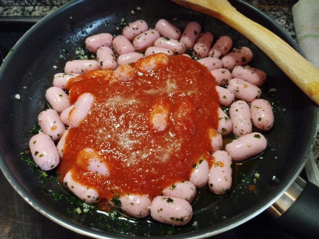 En una sartén o cacerola plana, echar un poco de aceite de oliva, el ajo y el perejil picado, cuando empiece a hervir, añadir las salchichas, mezclar y dejar hasta que cambie de color, o se dore un poco.