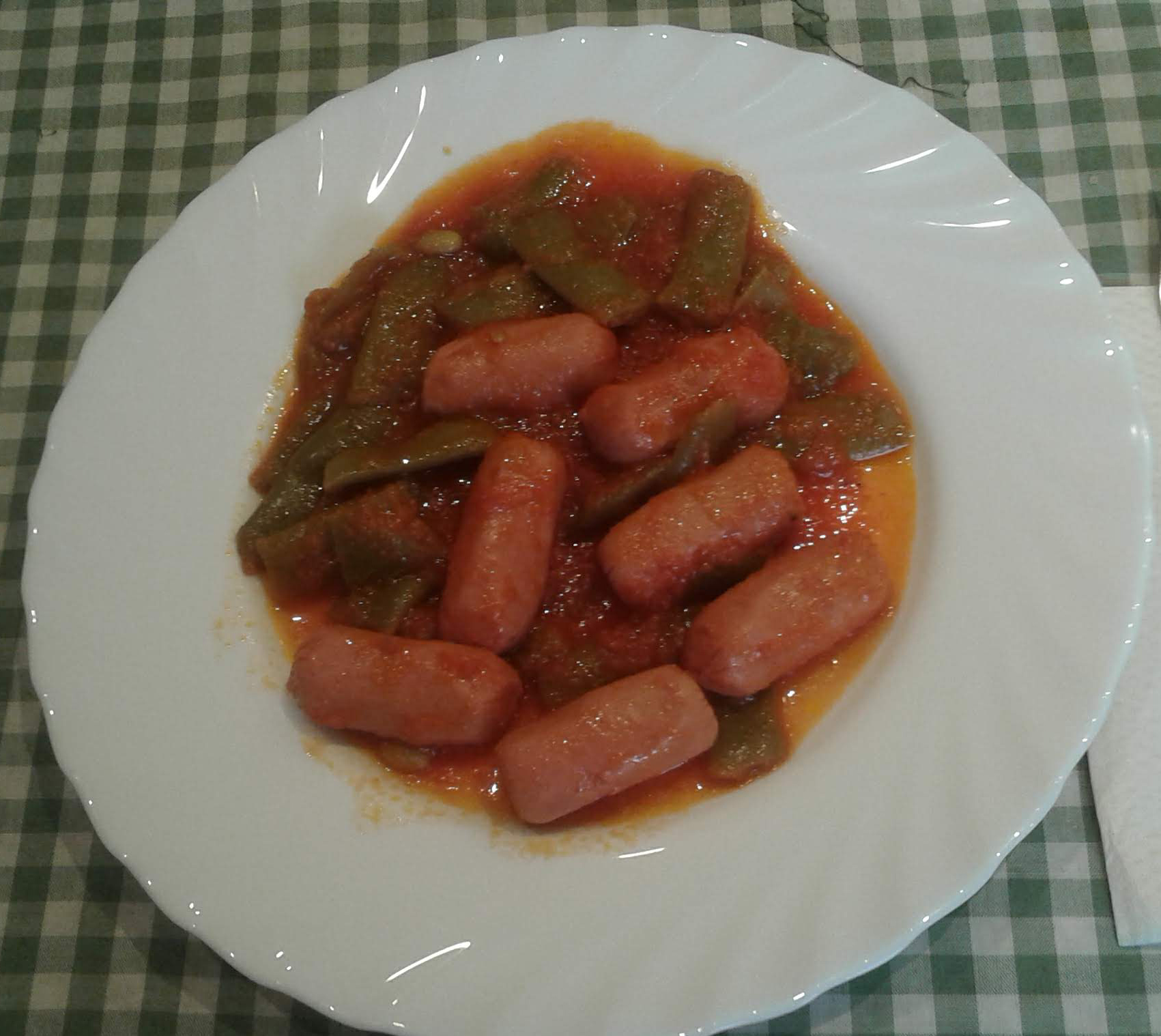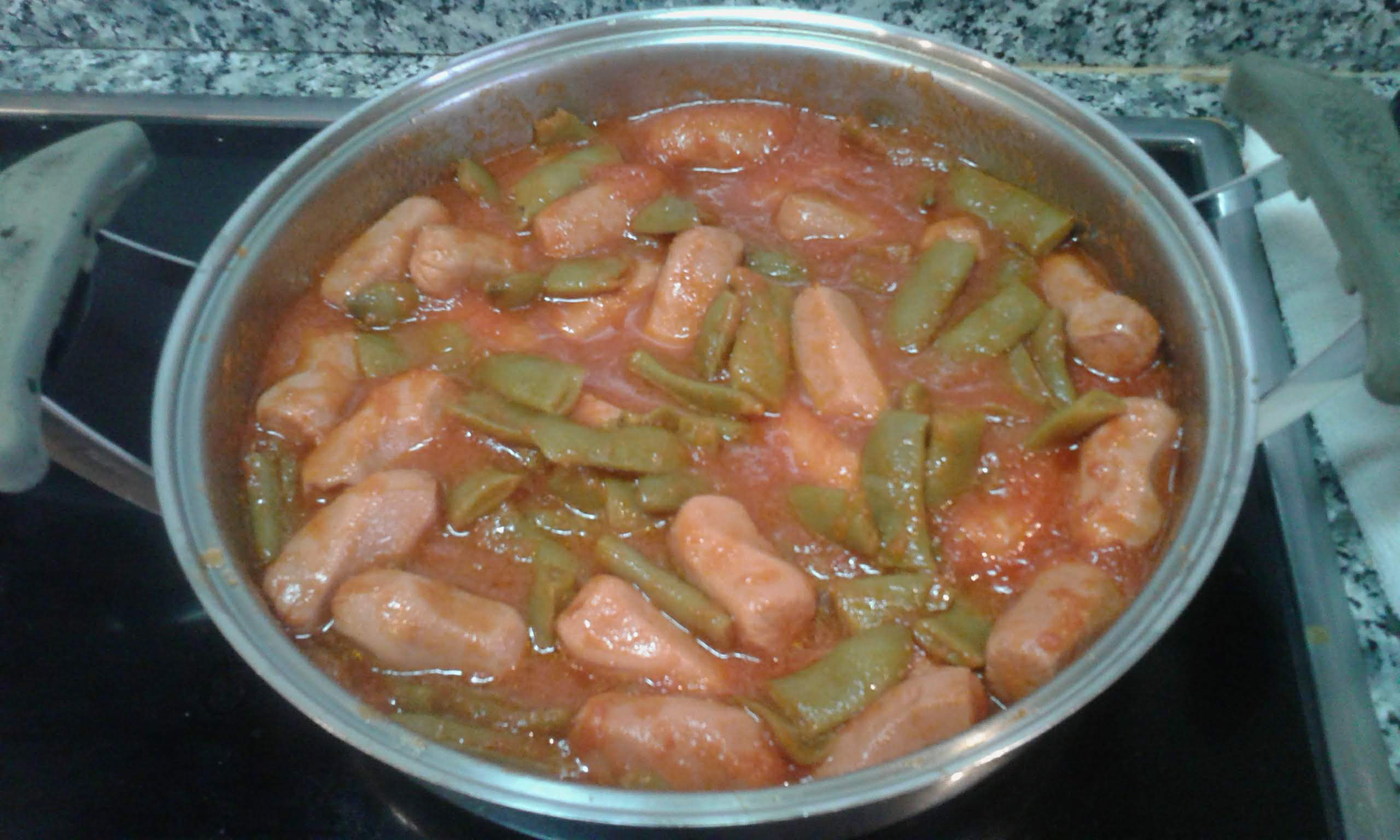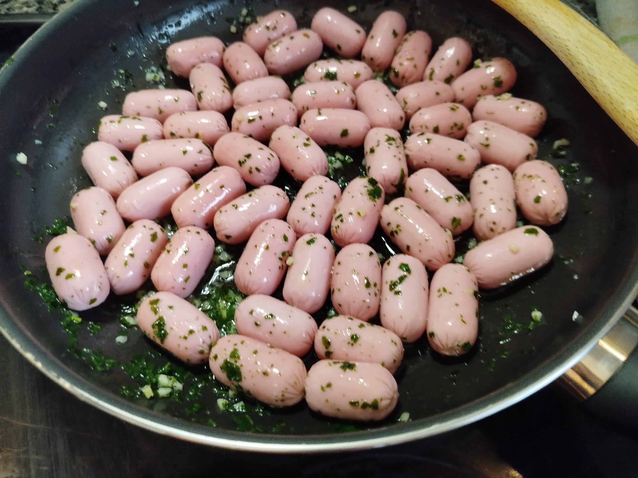 En una sartén o cacerola plana, echar un poco de aceite de oliva, el ajo y el perejil picado, cuando empiece a hervir, añadir las salchichas, mezclar y dejar hasta que cambie de color, o se dore un poco.