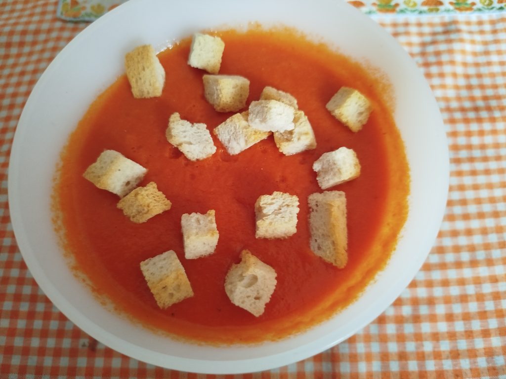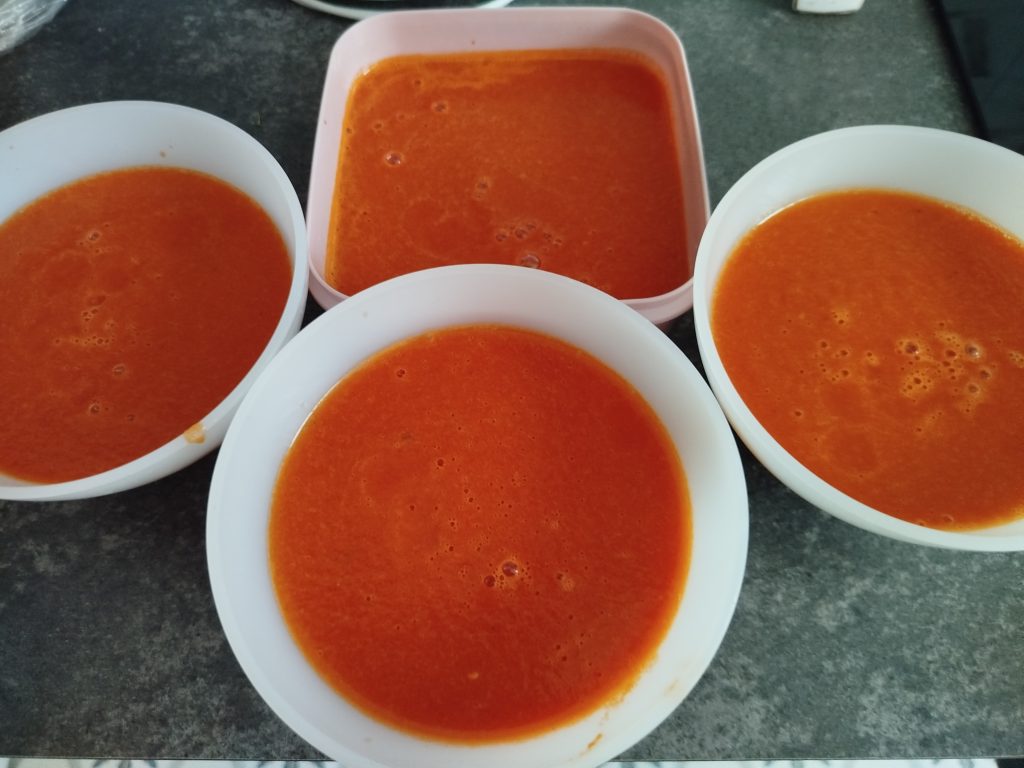 Salen para 4 raciones, hoy he repartido en 3 cuencos, y un táper para llevar, o para otro día, meter en el frigorífico, y tomar fresquito, al gusto de cada uno, con picatostes tostados, huevo duro y taquitos de jamón.