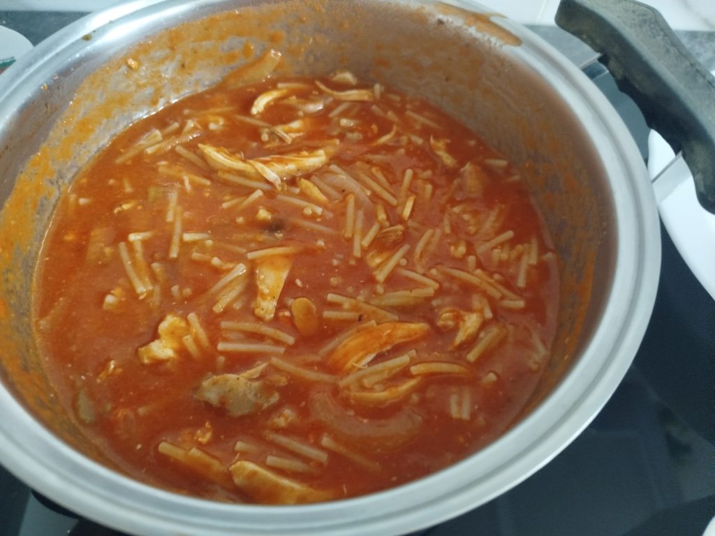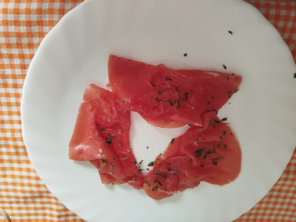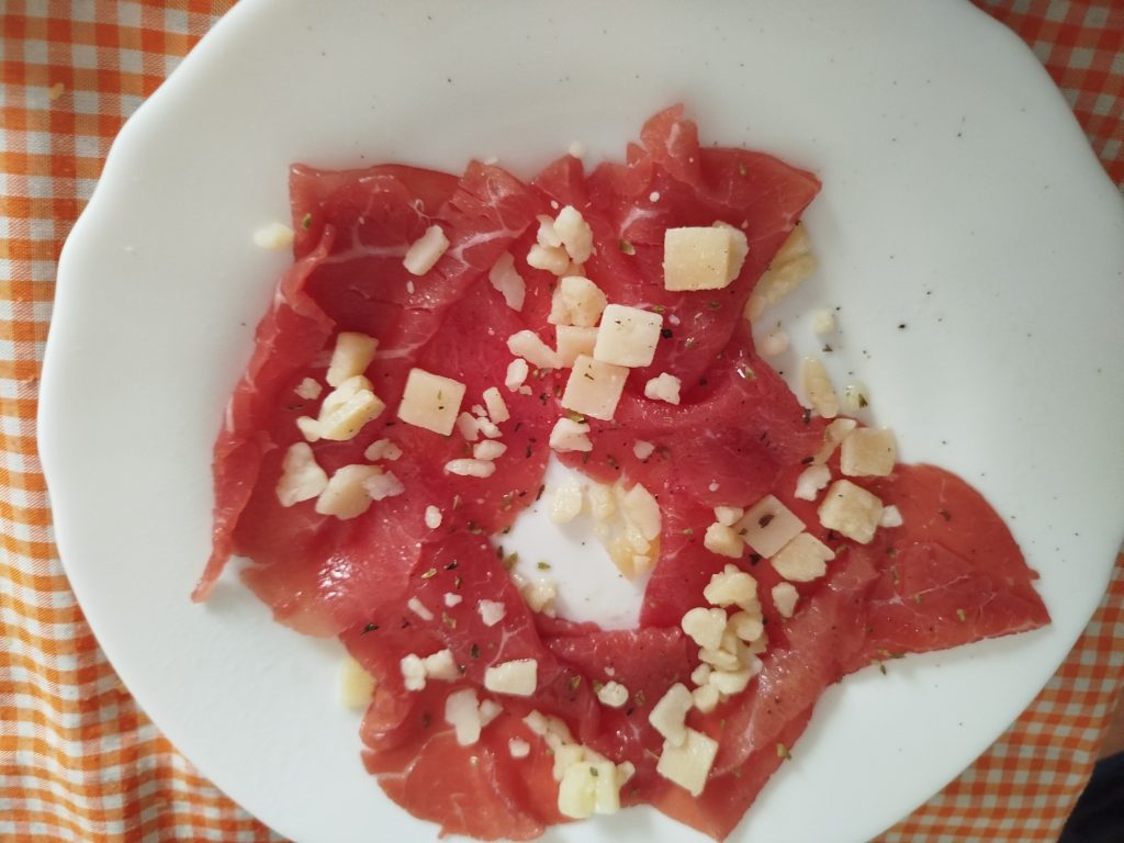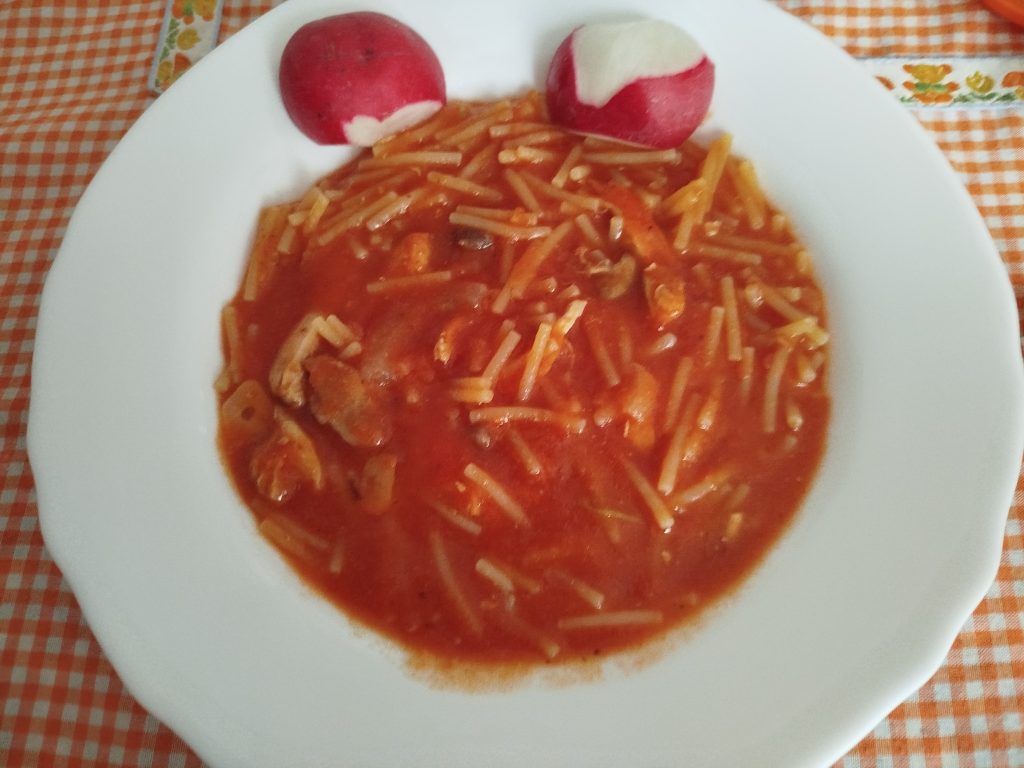 😊Esta vez lo acompañe con Carpaccio de ternera y tenía restos de Pollo con tomate, le añadí unos fideos, y hice una sopa.