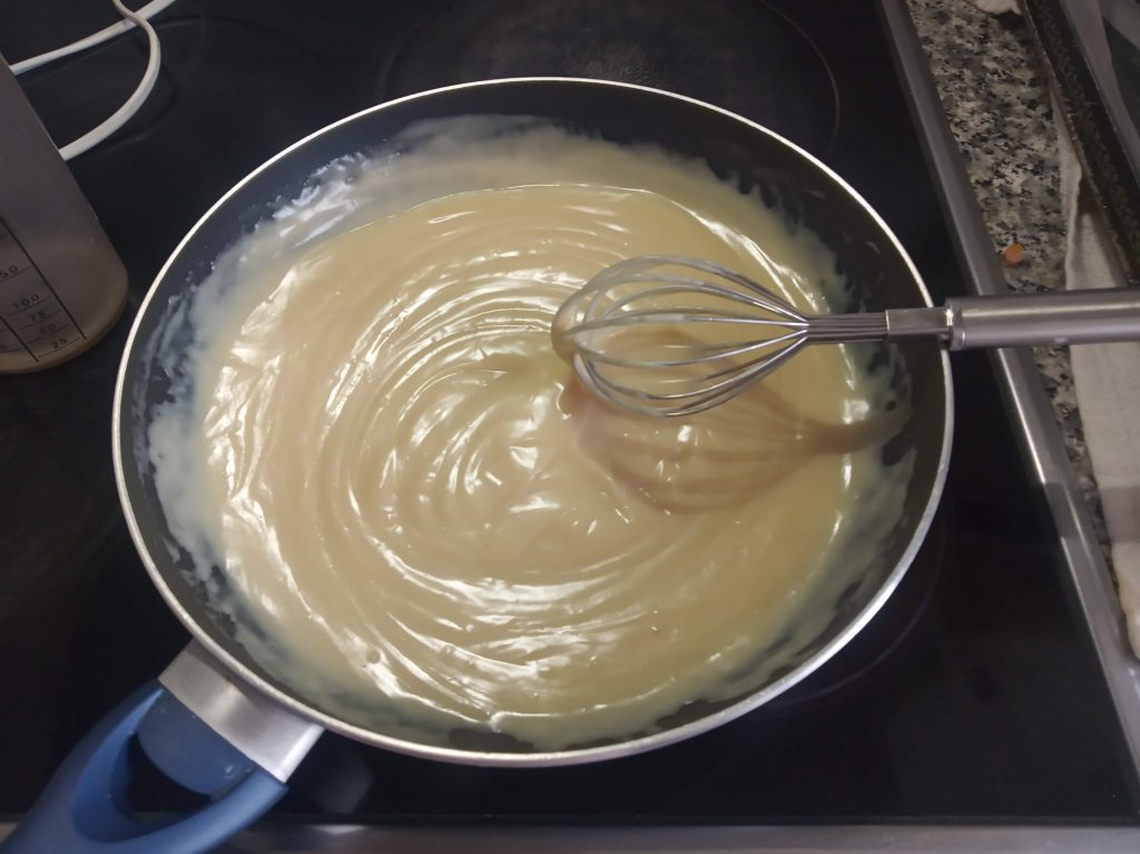 Le añadimos la mezcla de soja y maicena, y remover con unas varillas, hasta que espese.