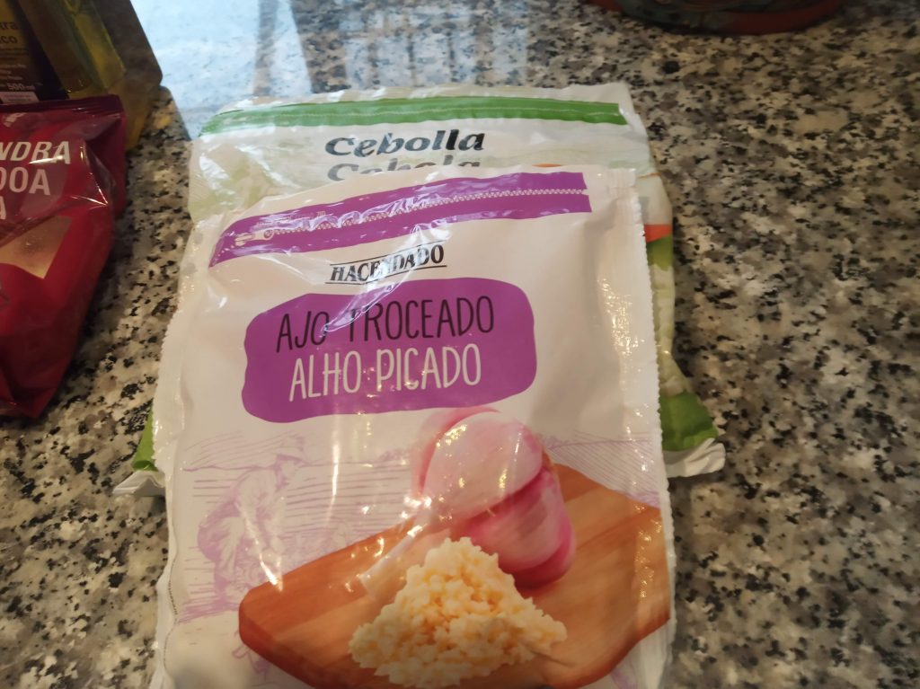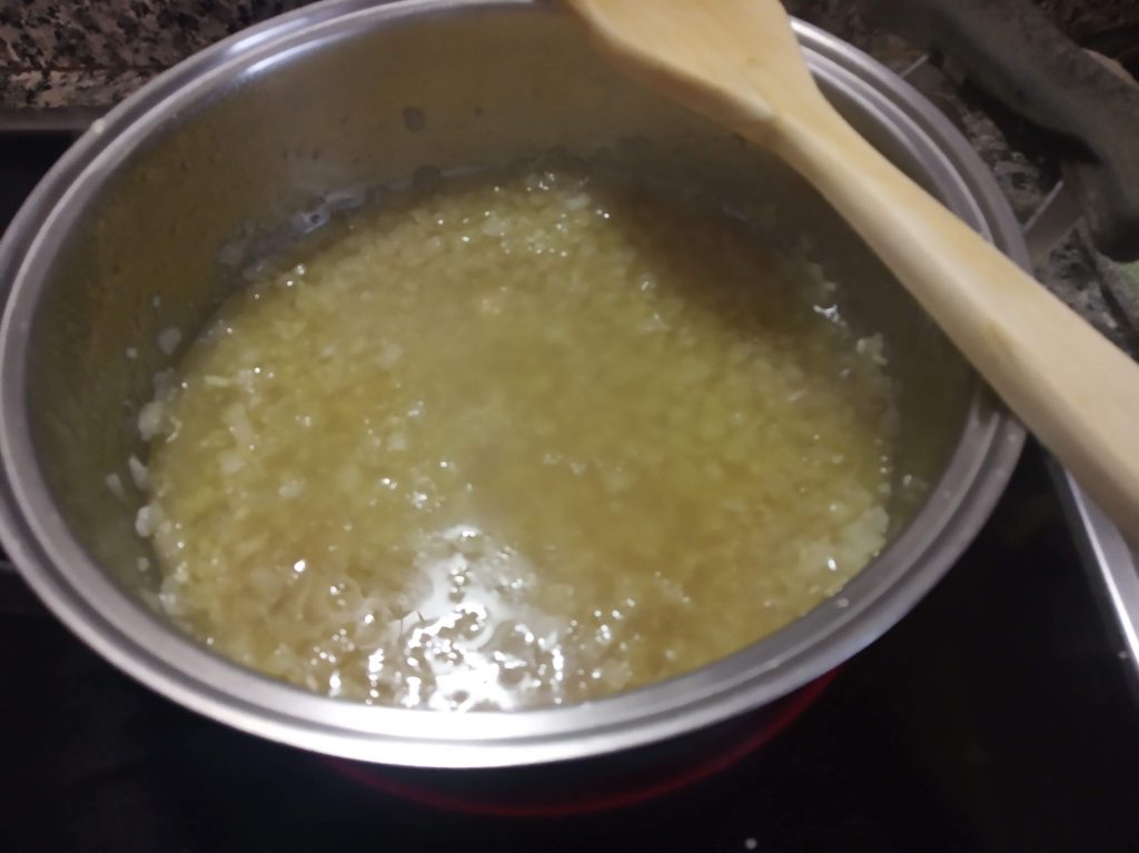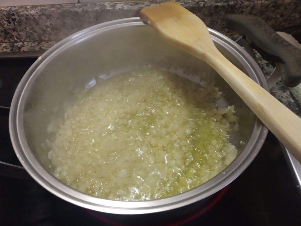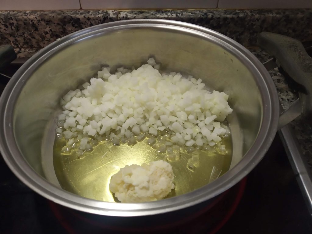 En un poco de aceite, pochamos la cebolla y ajos troceados, sin que coja color.