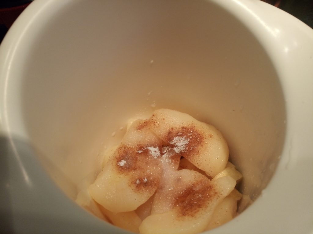 Pela y trocea el plátano y lo echas en un cuenco, abre una lata chica de peras, tira el jugo, y la troceas también, le añades 2 o 1 cucharada de Stevia granulada, 1 poco de canela molida.