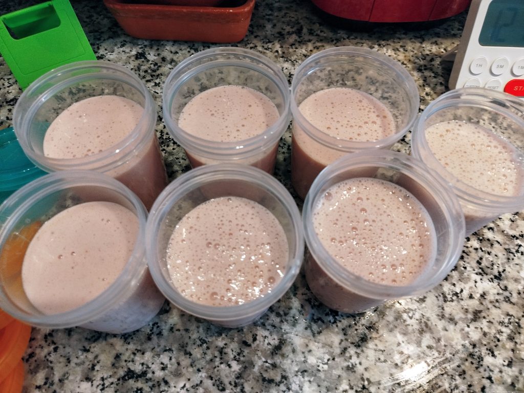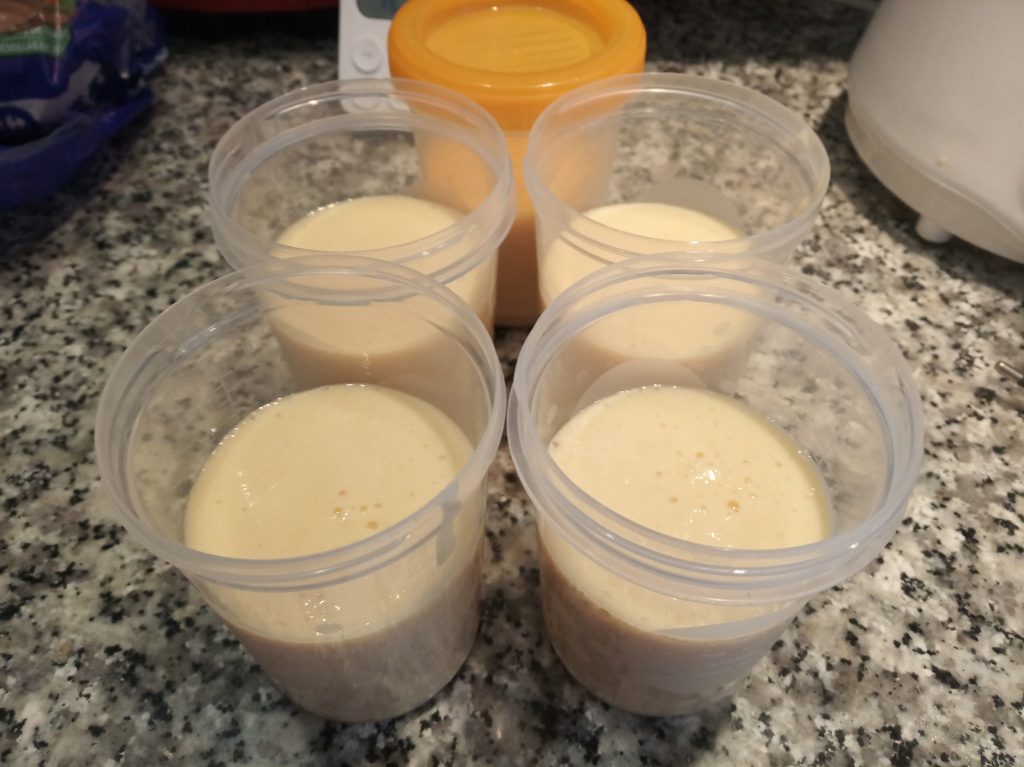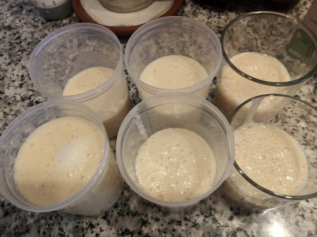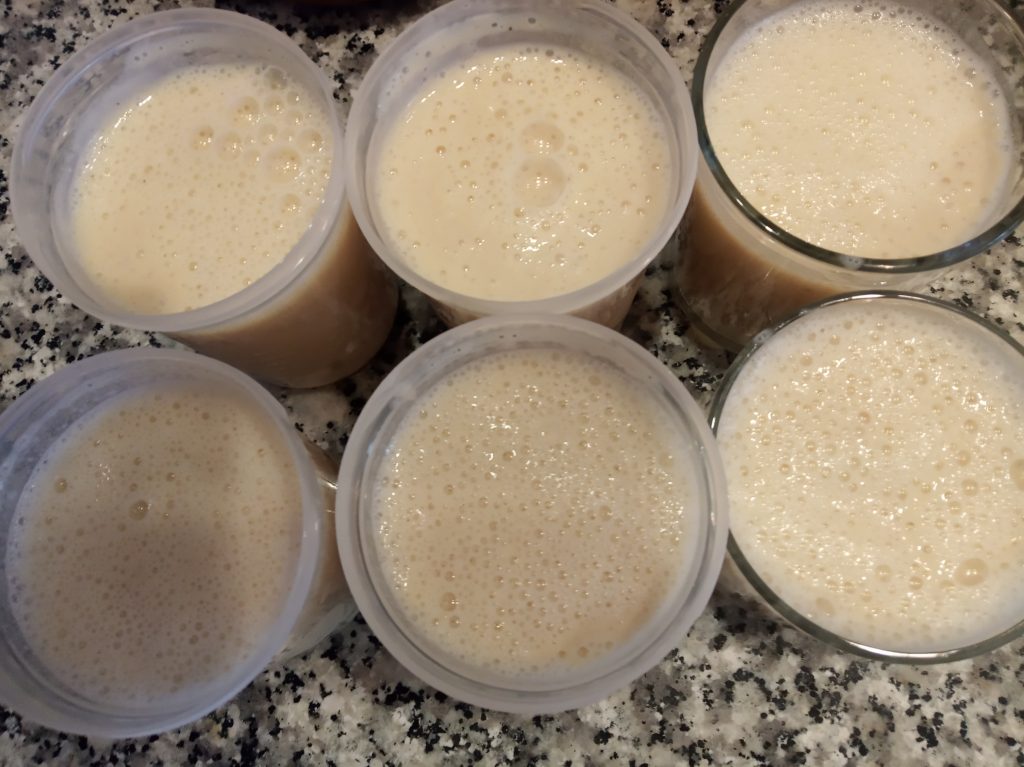 Repartir en los vasos, sin llenarlos. Luego añadir más bebida de soja, hasta terminar de rellenar. Mesclar muy bien con una cuchara, tapar y guardar en el frigorífico.