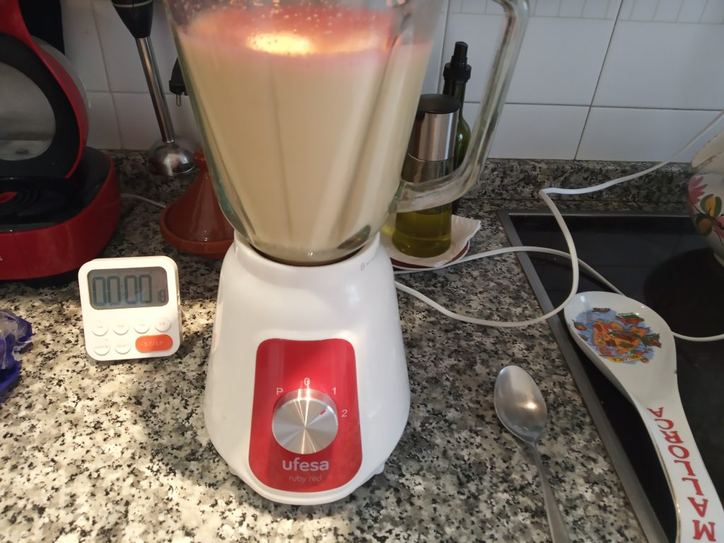 Triturar con la minipimer, añadir un poco de bebida de soja, mezclar todo muy bien.