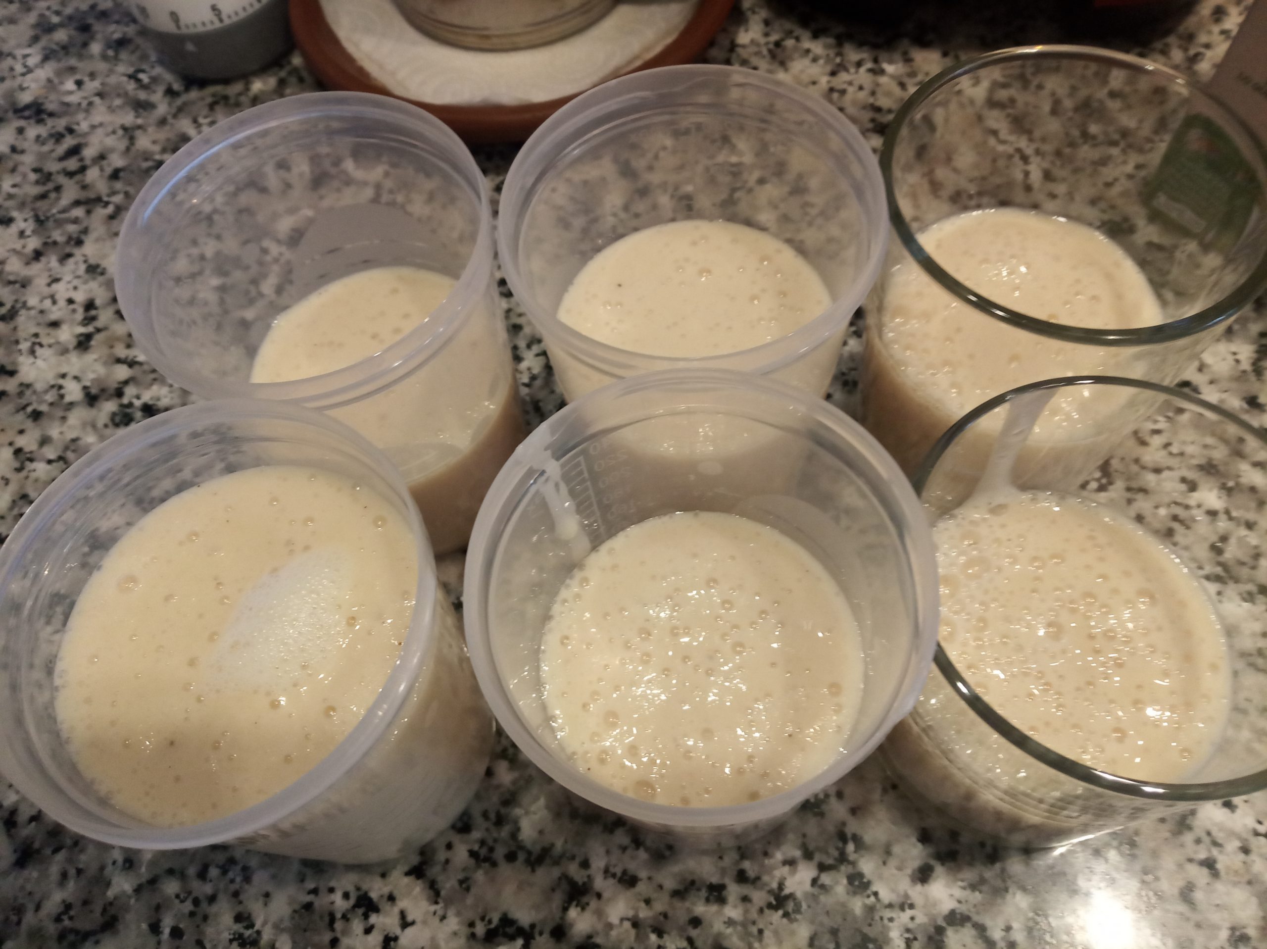 Repartir en los vasos, sin llenarlos. Luego añadir más bebida de soja, hasta terminar de rellenar. Mesclar muy bien con una cuchara, tapar y guardar en el frigorífico.