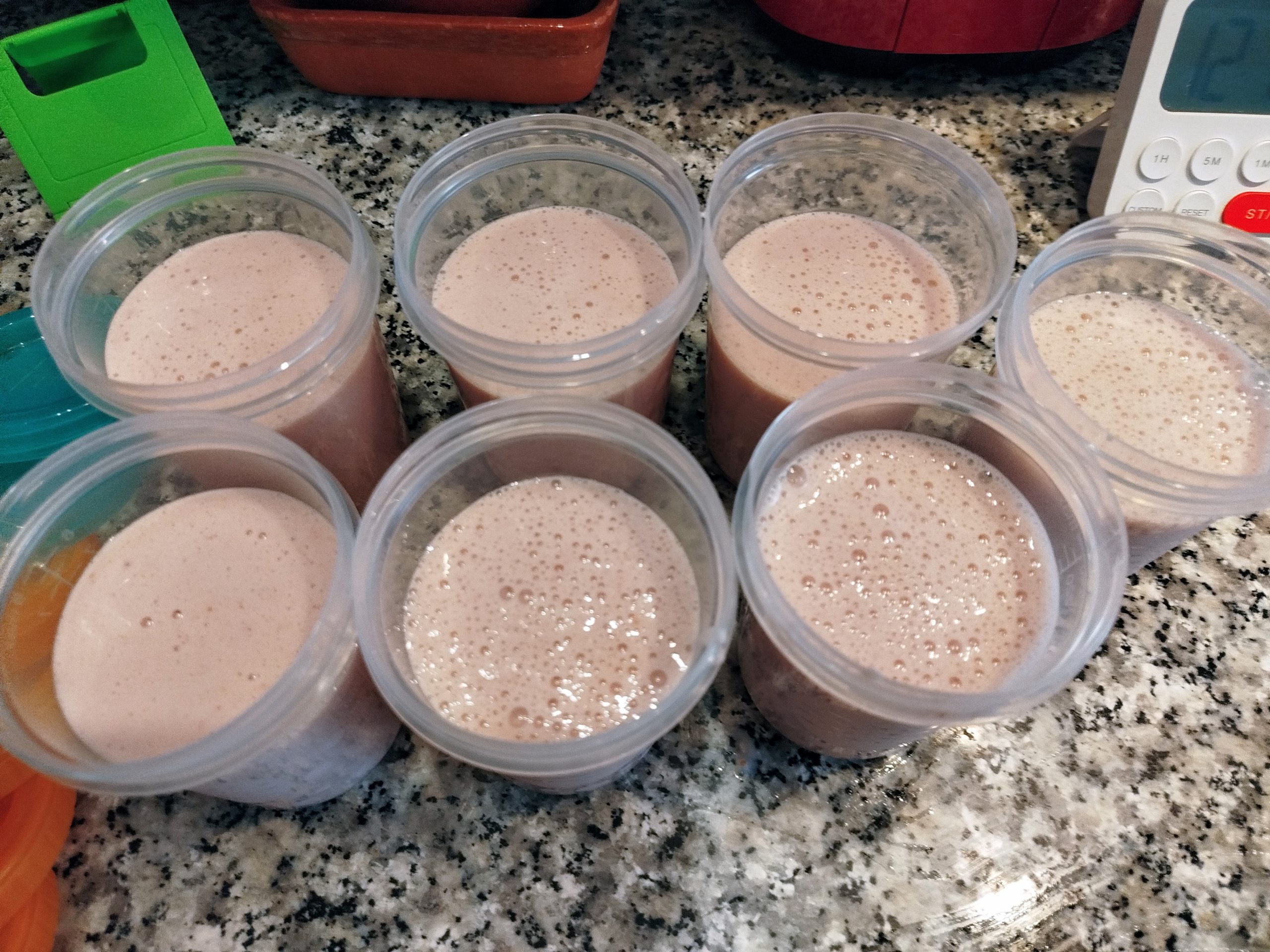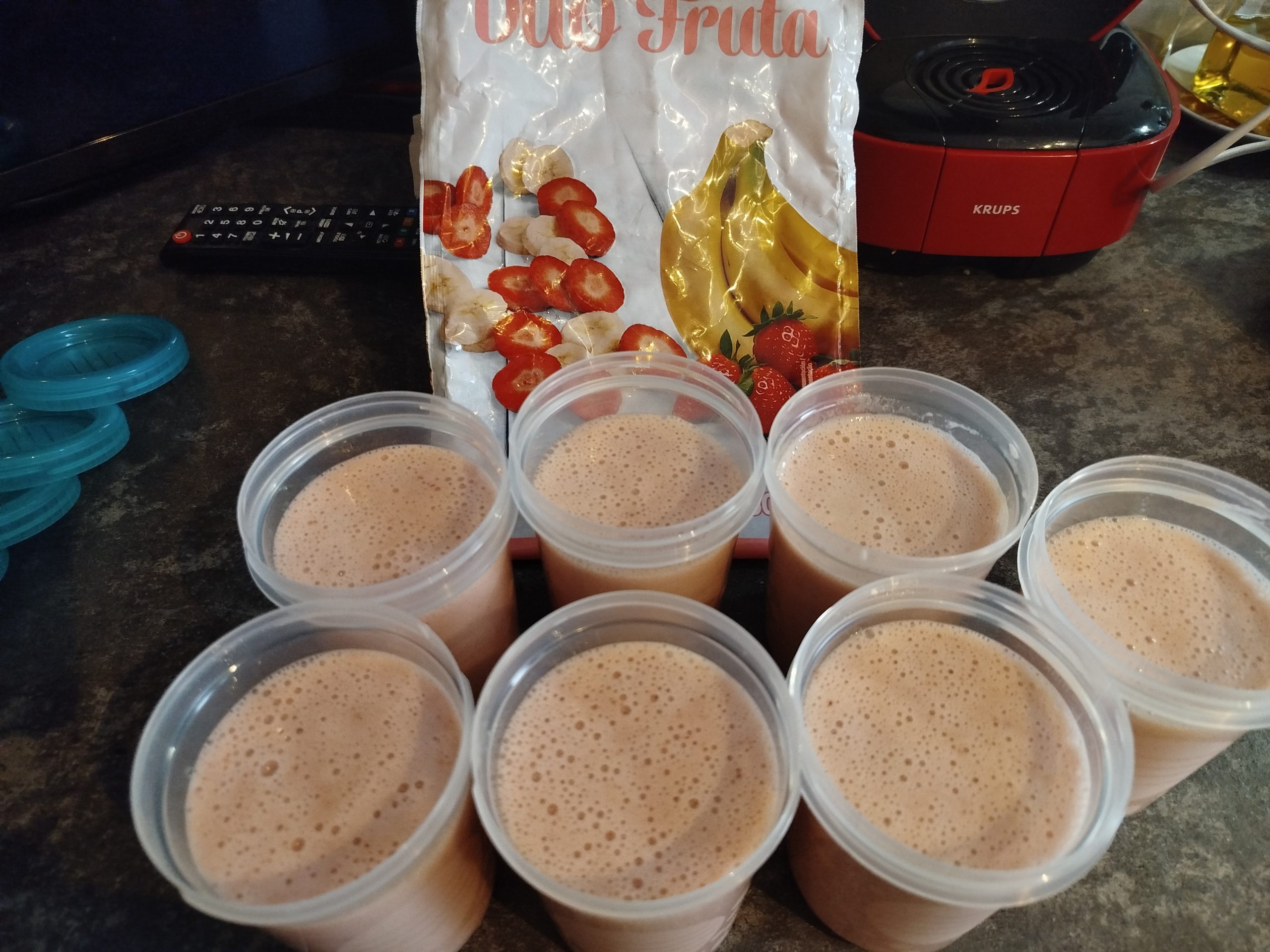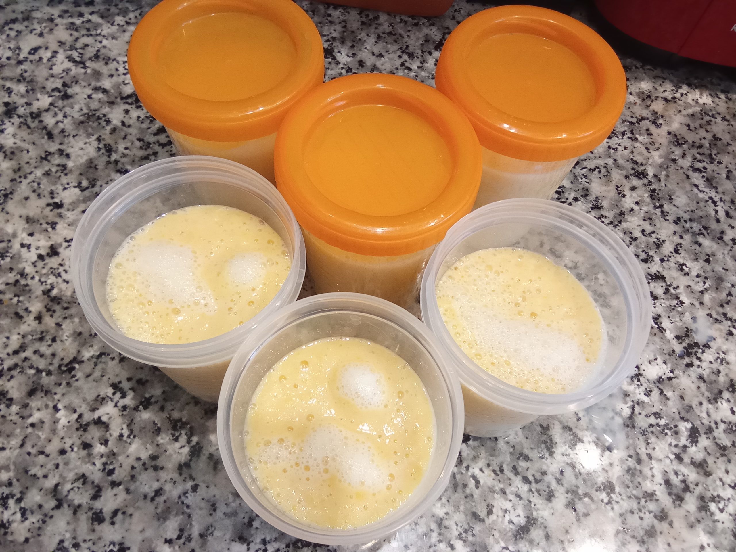 Repartir en los vasos, tapar y congelar, si tardas en tomártelo, la fruta fermenta y no tiene buen sabor, descongela el día anterior en el frigorífico, según vas a tomar.
