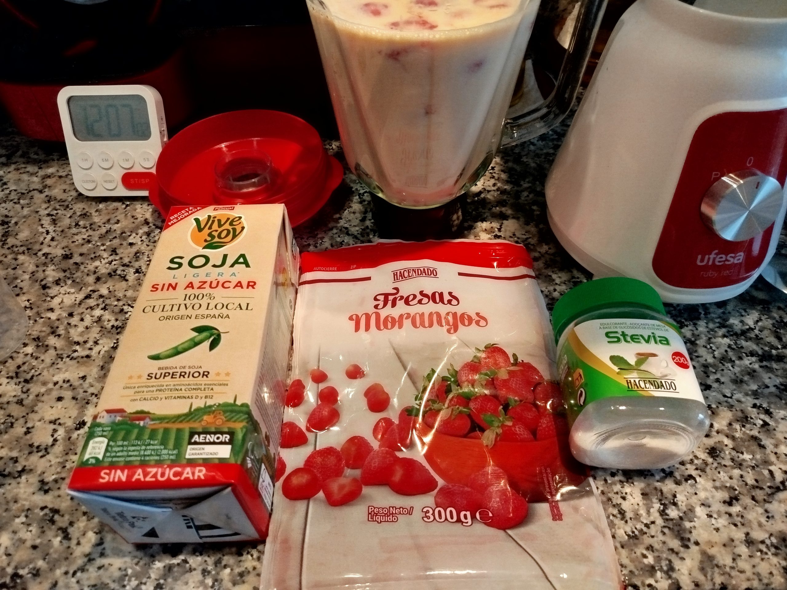 Triturar con la minipimer, añadir un poco de bebida de soja, mezclar todo muy bien.