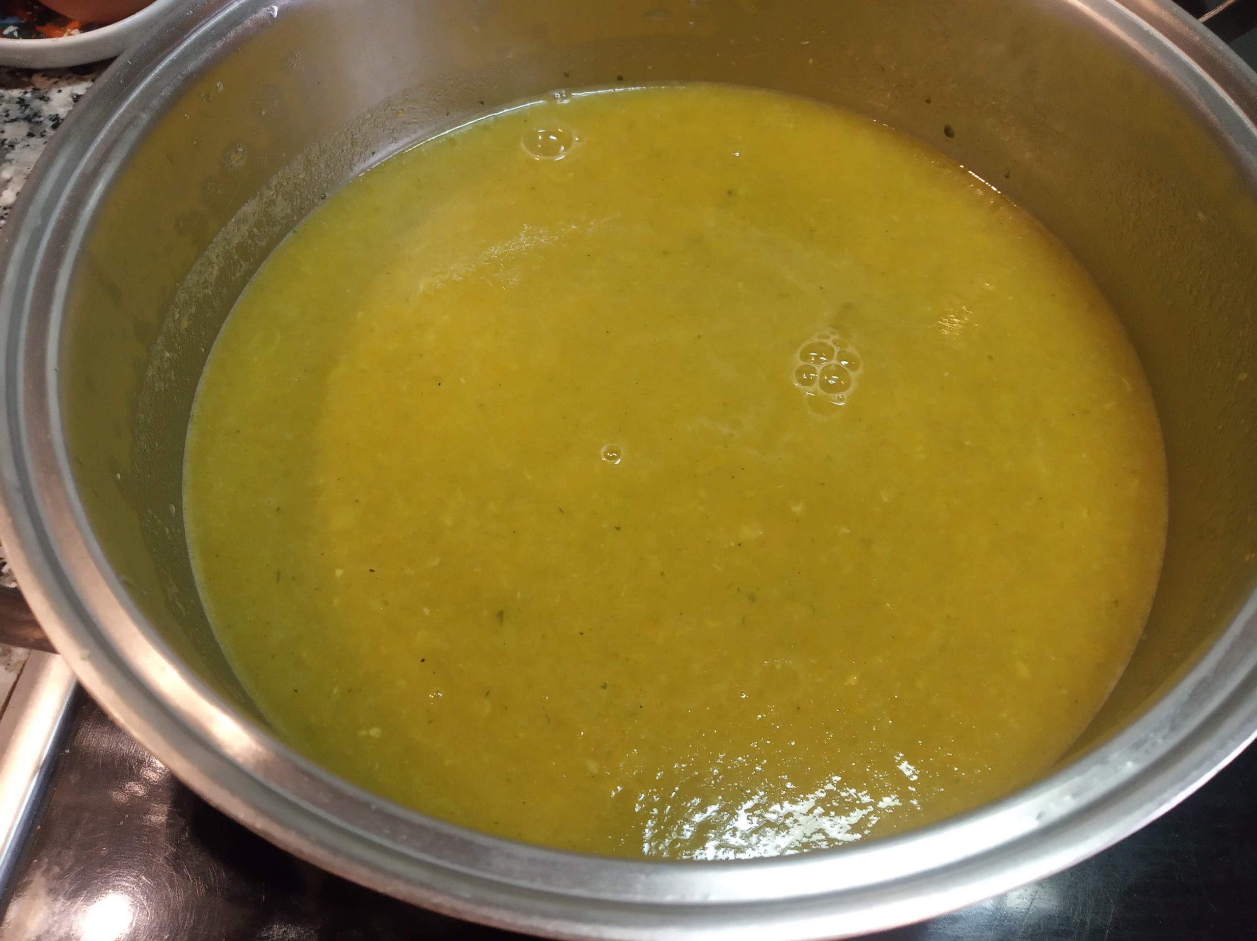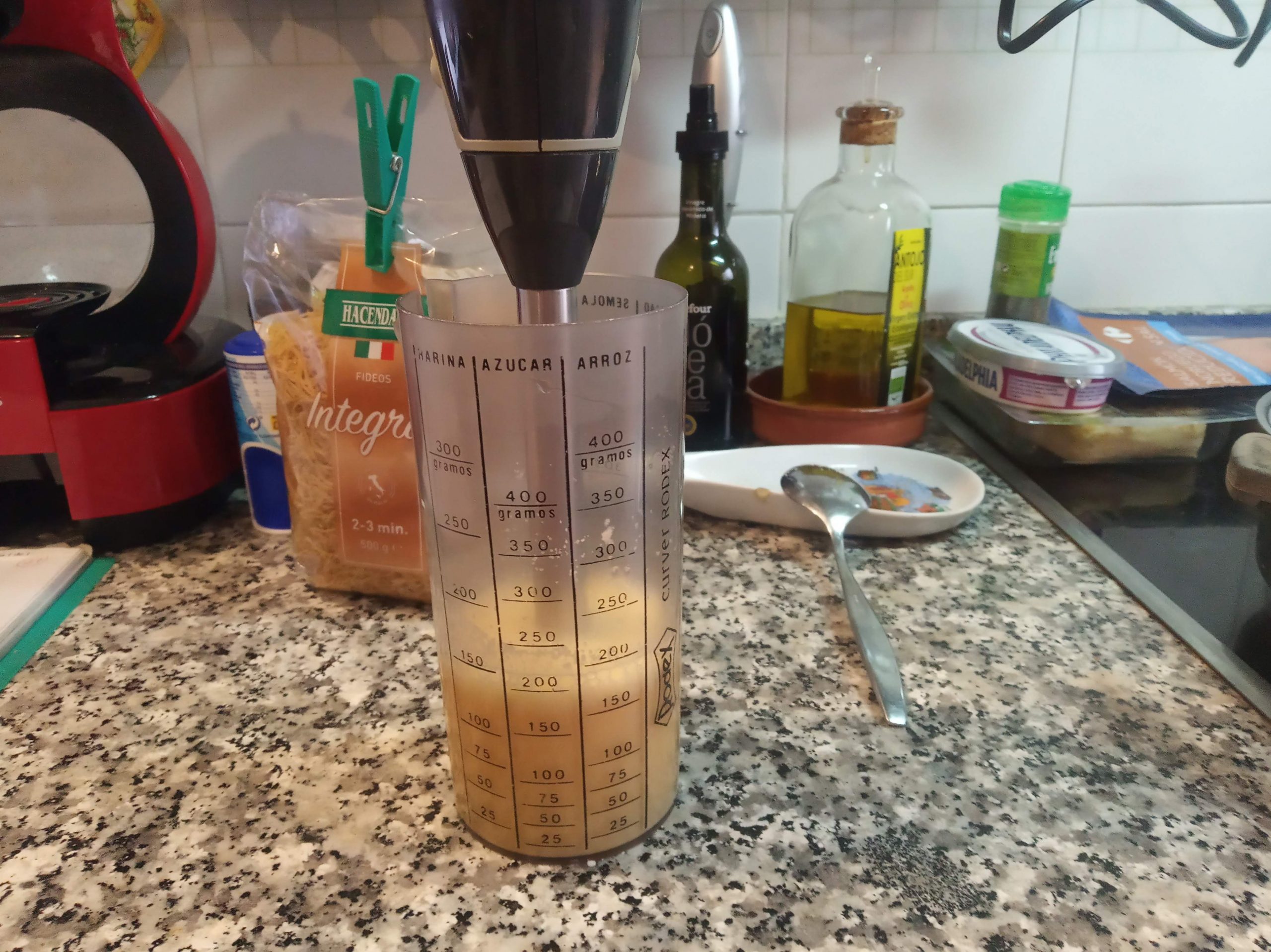 Se pasa la minipimer, y se le añade el otro ½ litro de caldo o de agua, con la pastilla desmenuzada, sal y pimienta.