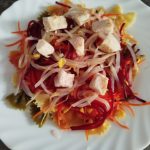Ensalada de pajarita con pollo y maíz dulce, zanahorias, remolacha y brotes germinados, aliñada a tú gusto