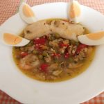 Un plato único, con pescado, gambas y almejas y de decoración yemas de espárragos y huevos cocidos. Sigue leyendo