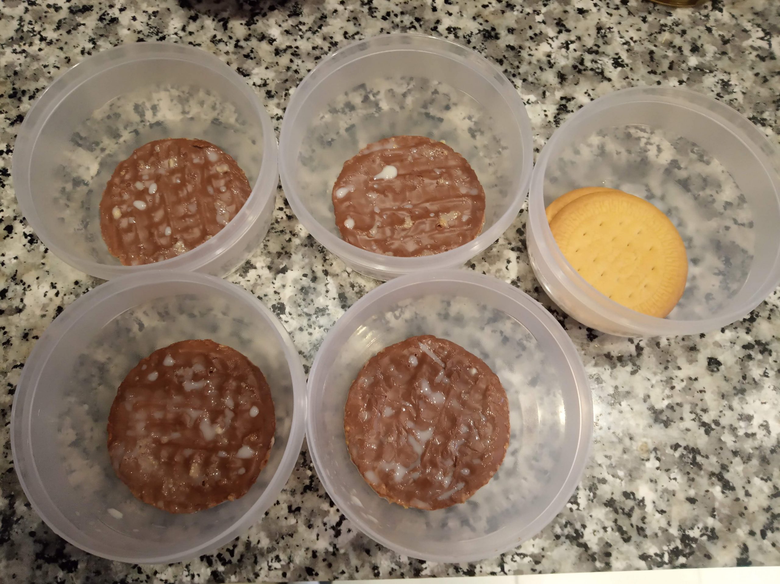 Mojar las galletas en la leche e ir poniendo en el recipiente que vais a utilizar. Si las galletas no caben en el recipiente, trocéalas un poco.