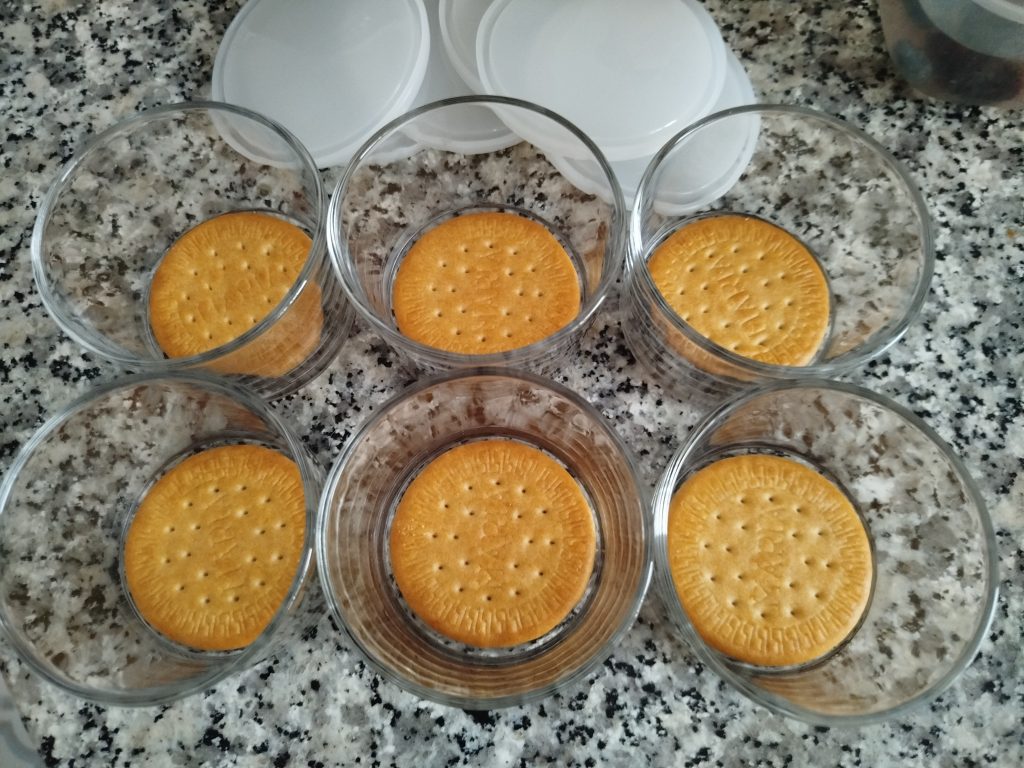 Si cabe bien, coloca 6 galletas, sin mojar en el fondo, o la rompe en trozos pequeños.