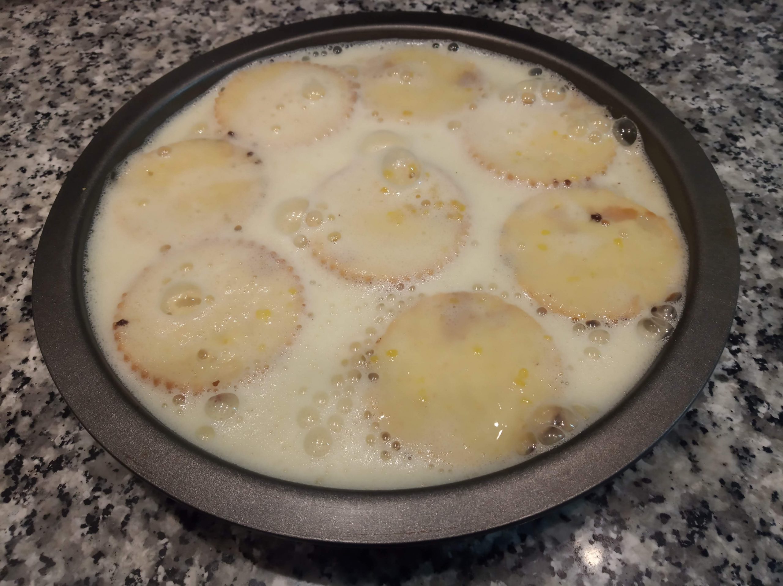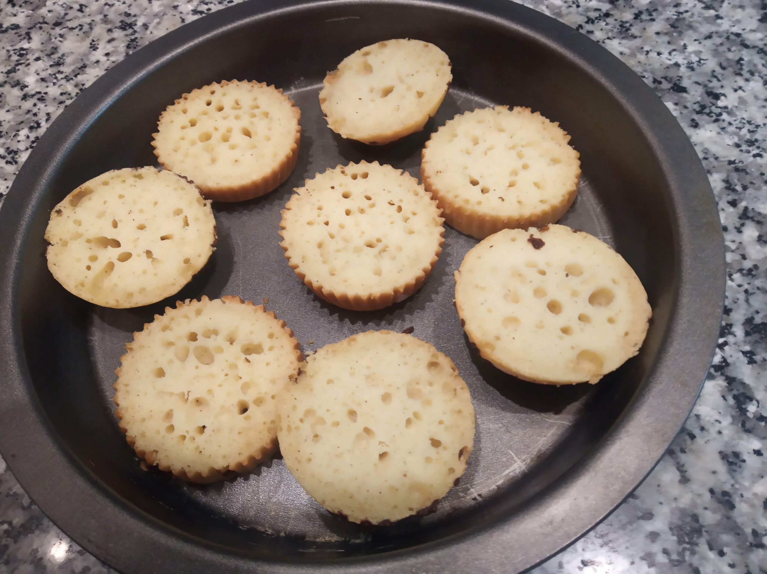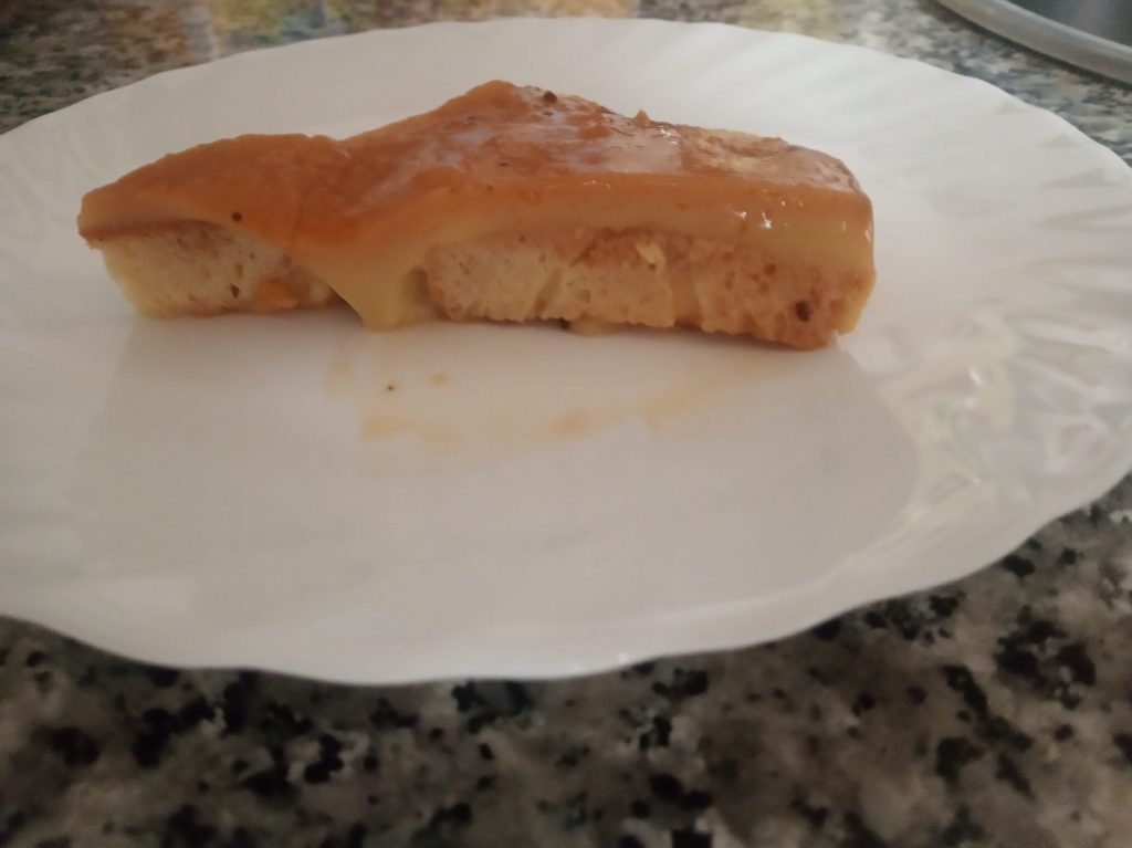 En el fondo de un molde redondo, echamos el caramelo líquido. Encima colocamos rodajas de magdalenas, primero las puntas para abajo y luego el resto. Yo utilices una 3 magdalenas caseras que tenia hechas.