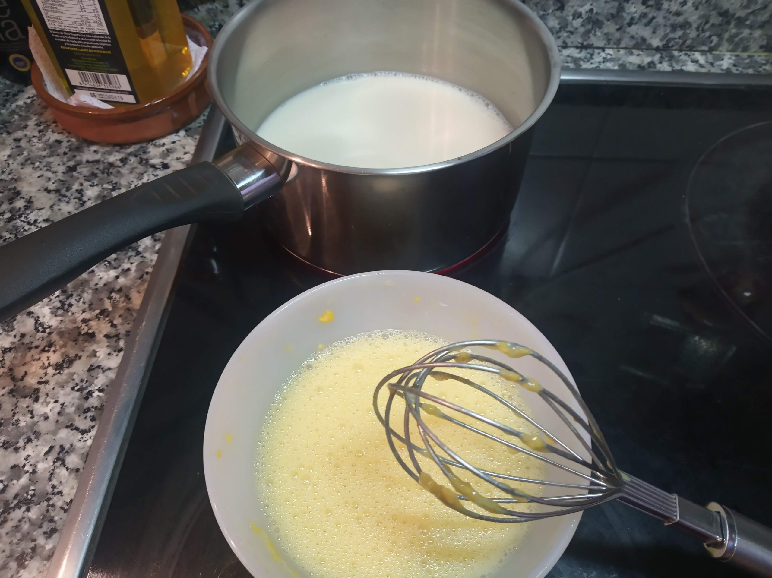 Mientras ponemos el resto de la leche o soja a calentar en un cazo. Cuando empiece a hervir, le echamos el contenido del bol, y mezclamos muy bien.