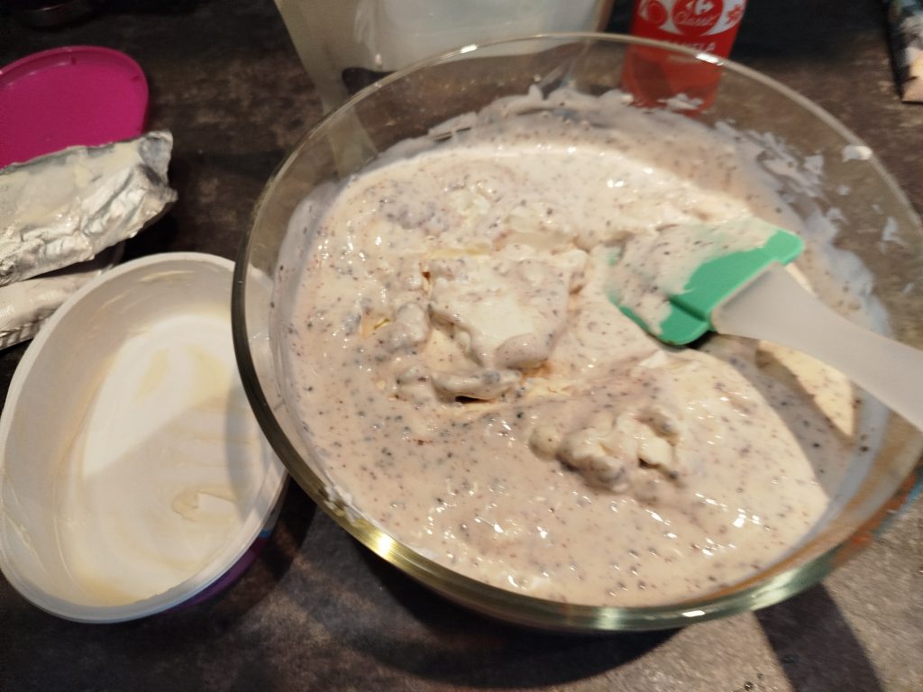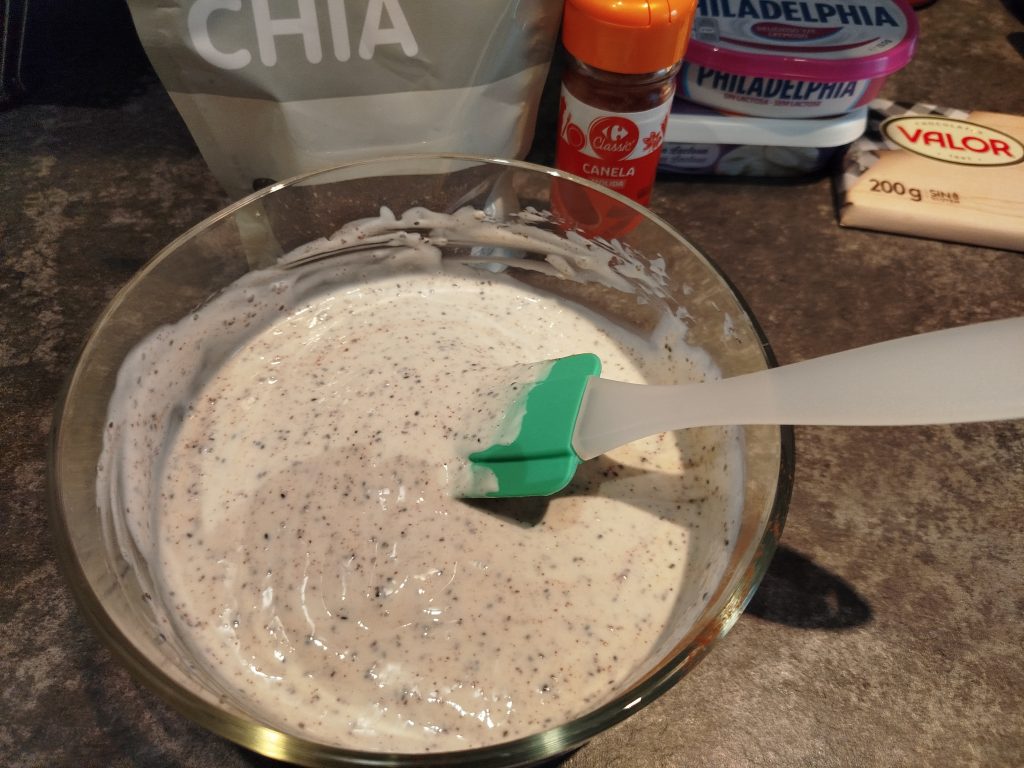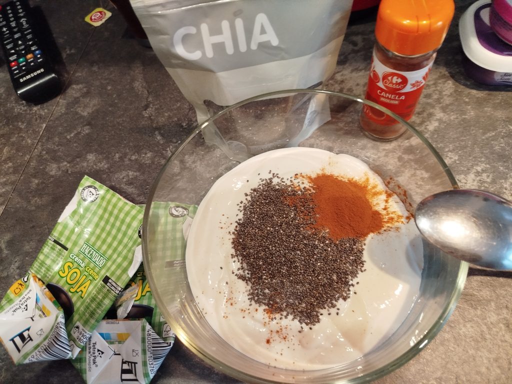 Echar los dos brick de crema de soja en un bol de cristal, echar un poco de semillas de Chía y el Eritritol, mezclar con la espátula todo muy bien.