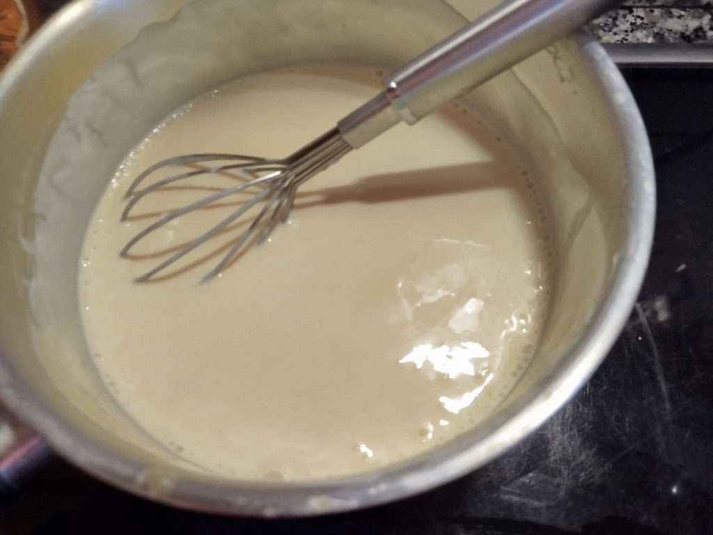 En un cazo, echamos la crema de soja, la crema de almendra y el queso de untar, mezclar todo muy bien.