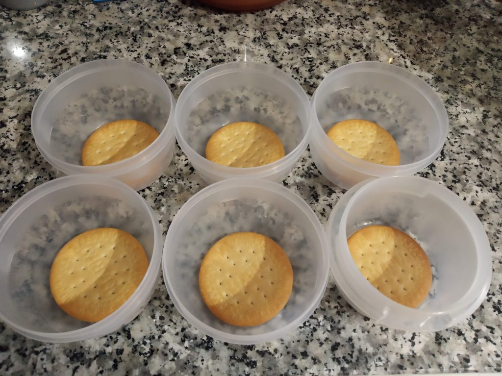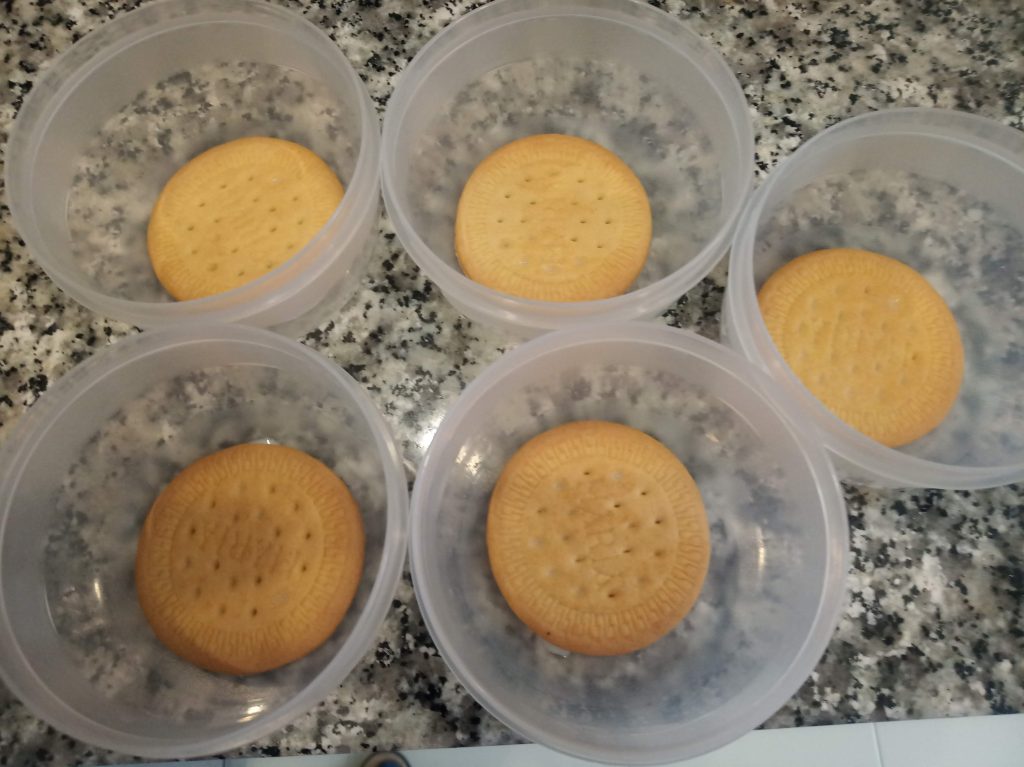 En vasos, copas o táper, poner una galleta y colocarla en el fondo.
