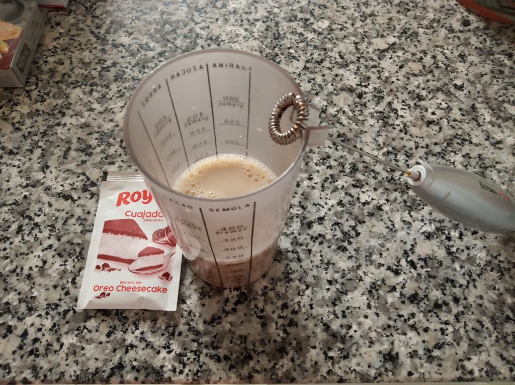 Disolver en la leche el sobre de la cuajada y el Eritritol.