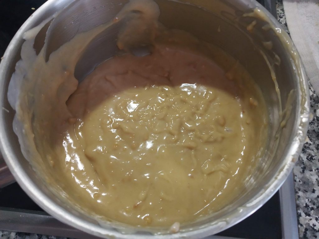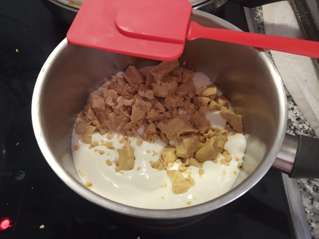Calentar la nata y disolver en ella el turrón troceado retirado del calor, con la paleta de repostería.