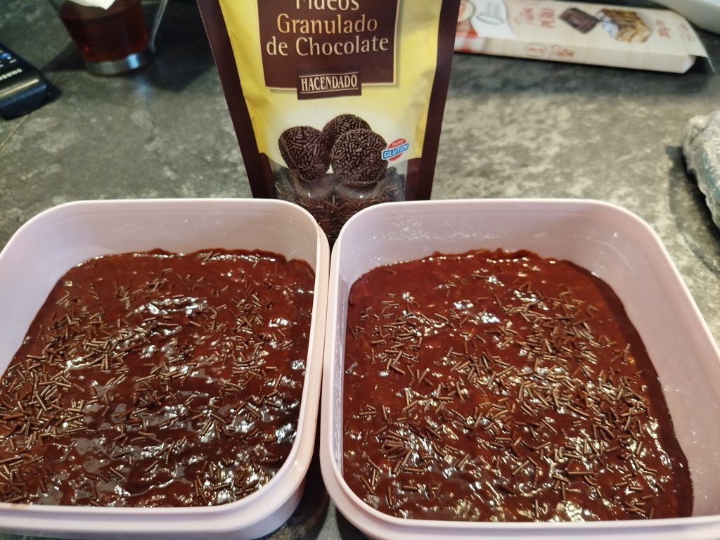 📜📷Receta y fotos realizadas el 08/11/2025 en dos táper y 4 plátanos maduros, cortados y congelados y fideos de chocolate para decorar.