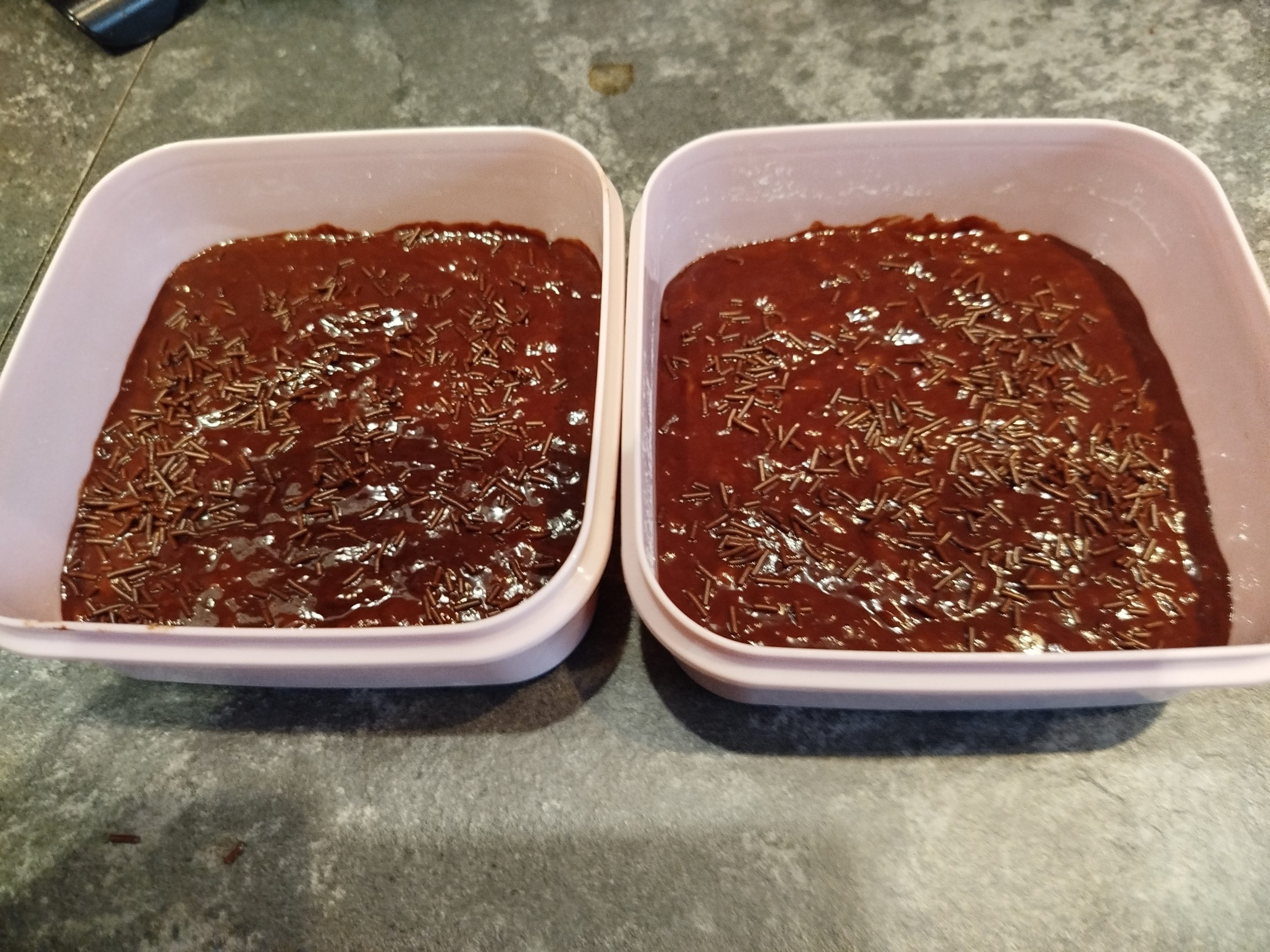 Esta vez lo repartir en dos táper, puedes hacerlo en uno solo, y desmoldar para cortar porciones, tú eliges.