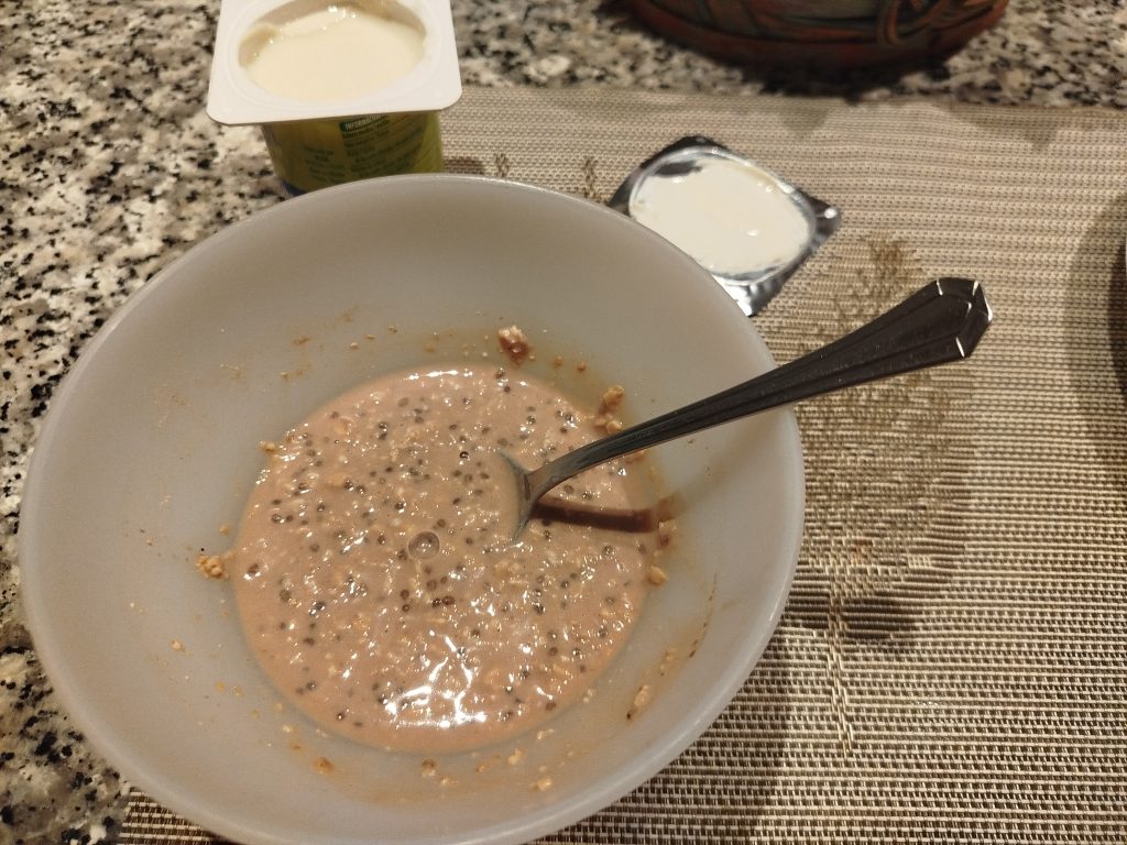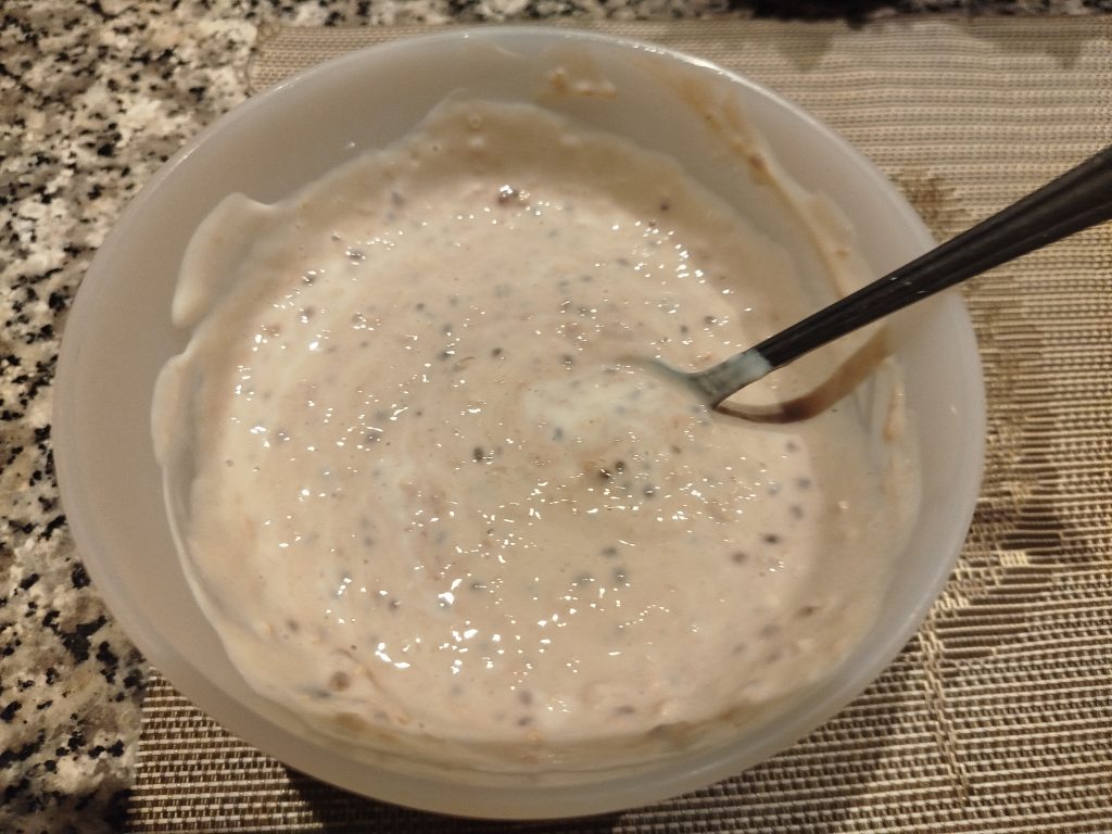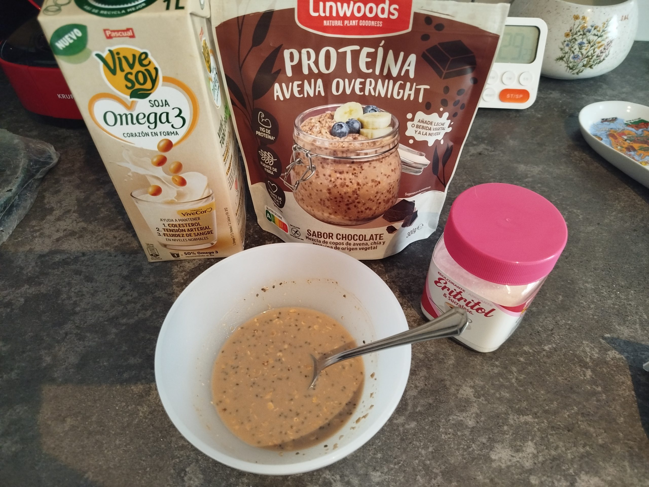 Echar según las medidas con o sin yogur, la proteína, la bebida de soja, el Eritritol y el cacao en polvo, dejar reposar mínimo tres horas o toda la noche.