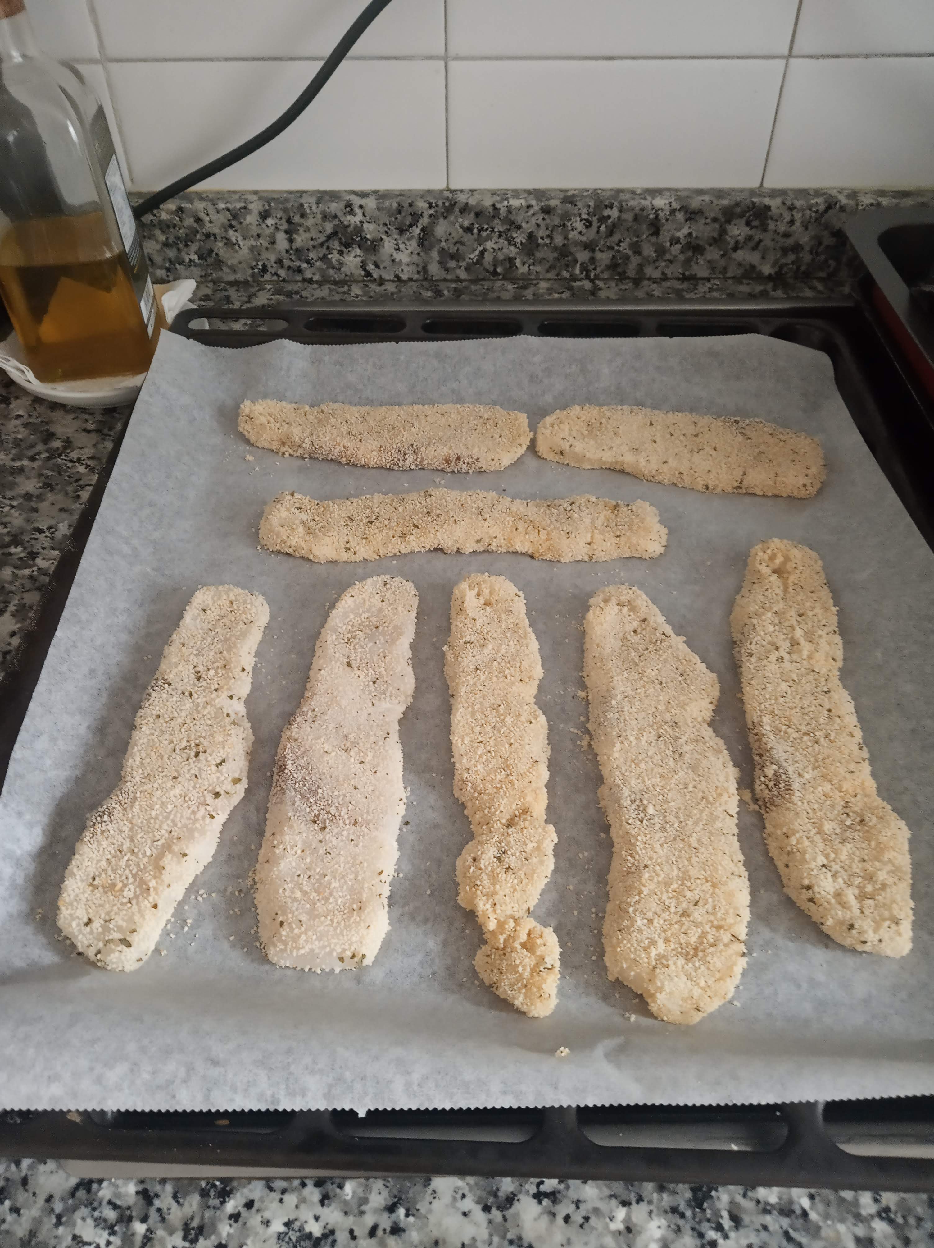 Ir poniendo los filetes en la bandeja de horno, sobre el papel sin que se monten unos con otros.