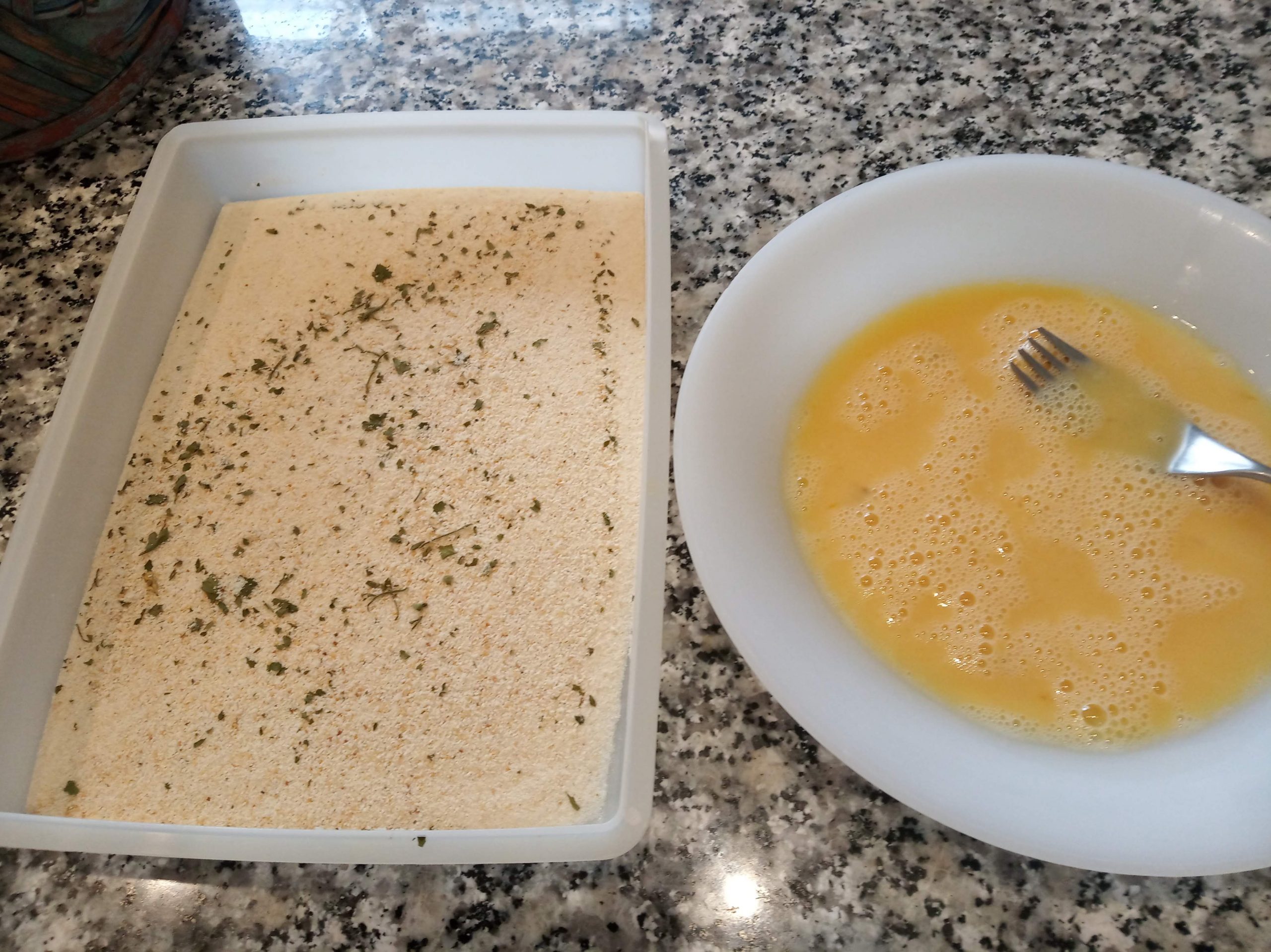 Echamos en otro plato llano o bandeja, el pan rallado con ajo y perejil.
