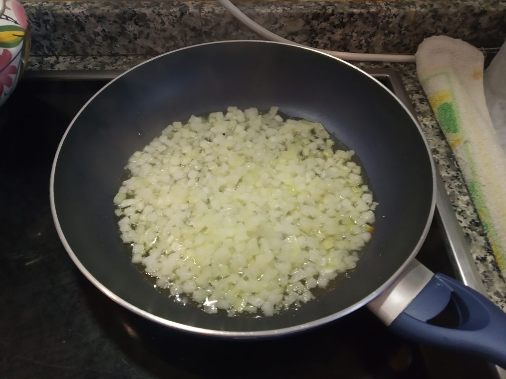 Poner en una sarten un poco de aceite y la cebolla troceada, con un poco de sal.