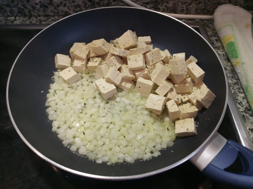 Cuando la cebolla este trasparente, añadir el Tofu troceado, con un poco de sal y pimienta, y si quieres un poco de orégano, mezclar todo bien y dejar hacer unos 5 minutos.